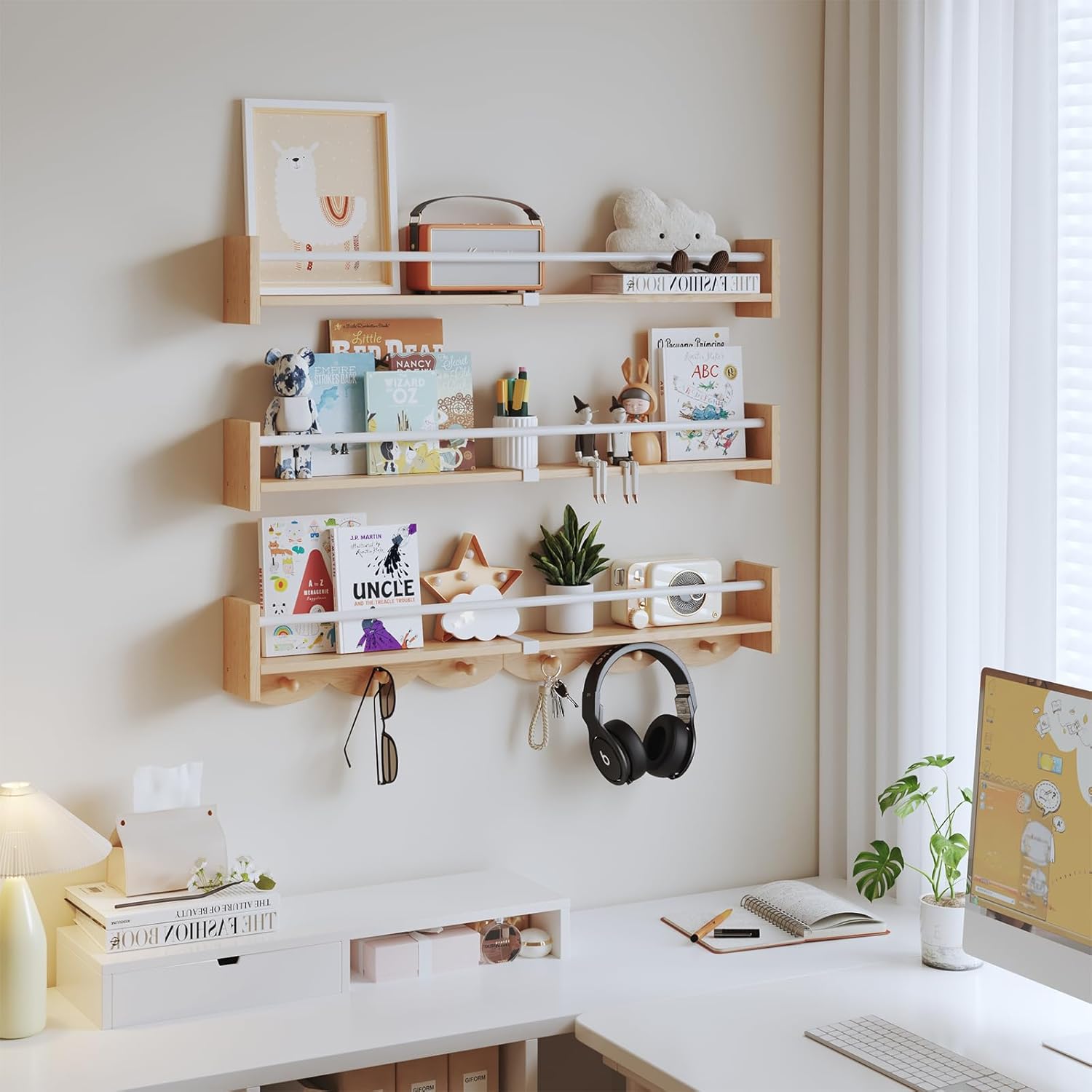 Nursery Bookshelves Wall Mounted,34inch,Set of 3, Floating Shelf Kids Coat Rack with 6Hooks,Hanging Shelf for Baby Nursery Room Décor, Patent Number: 29924445,Burlywood