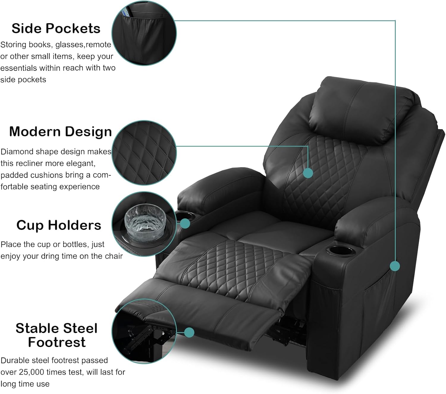 - POWER RECLINER CHAIR: Experience ultimate comfort with our electric recliner chairs featuring a smooth, silent power motor that adjusts effortlessly from 95 to 160 degrees at the touch of a button. Crafted with faux leather recliner chair, it offers a supremely comfortable sitting experience complemented by a classic wingback design that adds elegance to any room. Ideal for reading, movie-watching, or napping, this versatile oversized recliner chair provides personalized comfort for adults, seniors, individuals with mobility issues, and expectant mothers alike