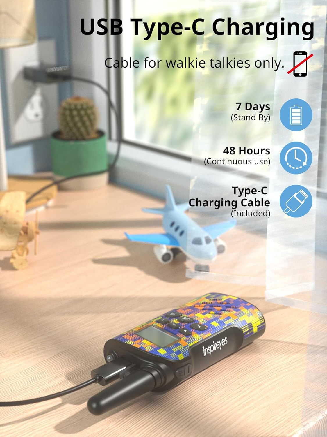 - Inspireyes rechargeable kids walkie talkies are rechargeable and long lasting, featuring an upgraded built-in lithium polymer battery. There is no need to buy extra AAA batteries. Kids can enjoy up to 48 hours of playtime and 7 days of standby on a single charge.