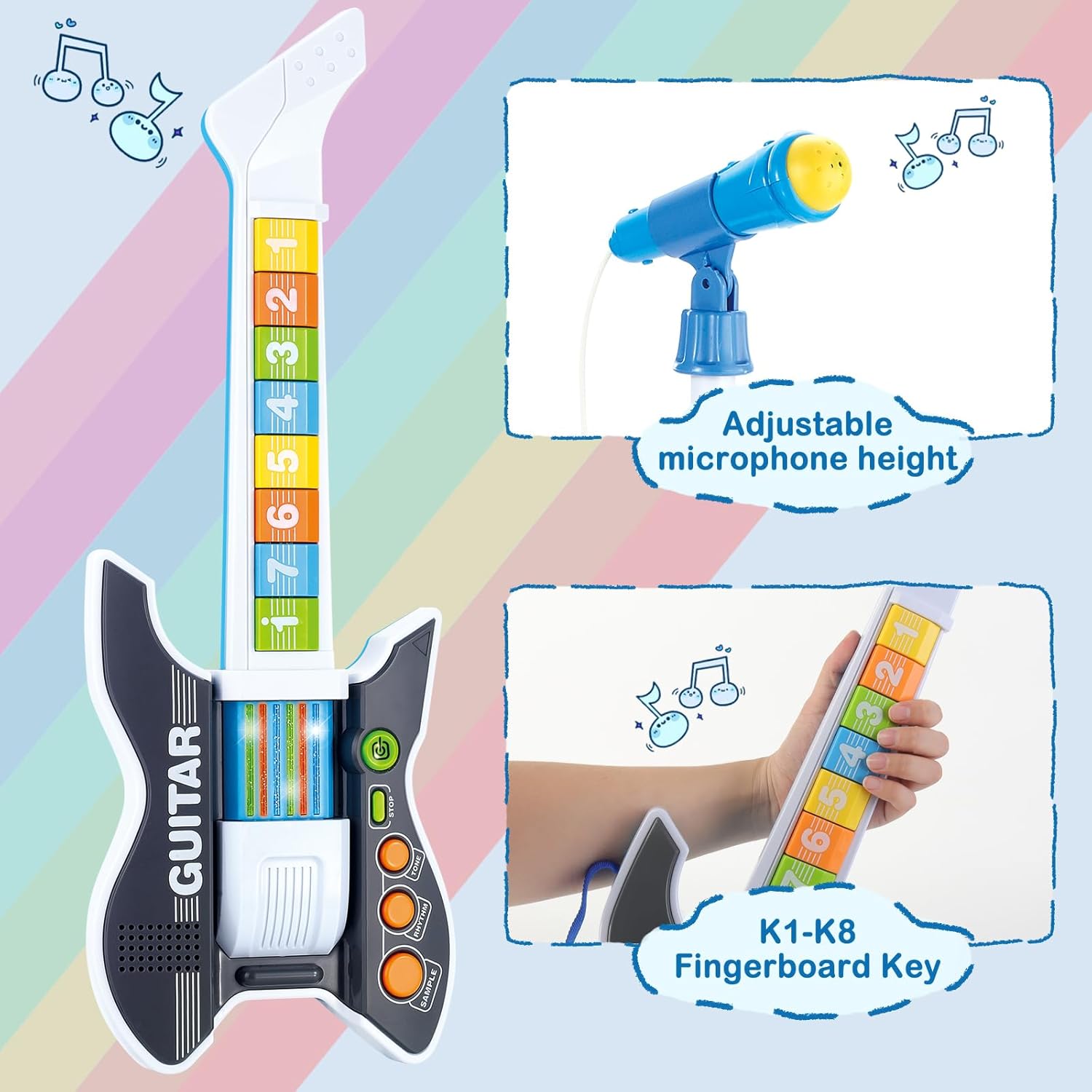 - Multifunctional Music Toy:The guitar toy has 8 fretboard keys, 3 tones and 8 rhythms. Children can try to create or play many different types of music and bring a rich and colorful playing experience.