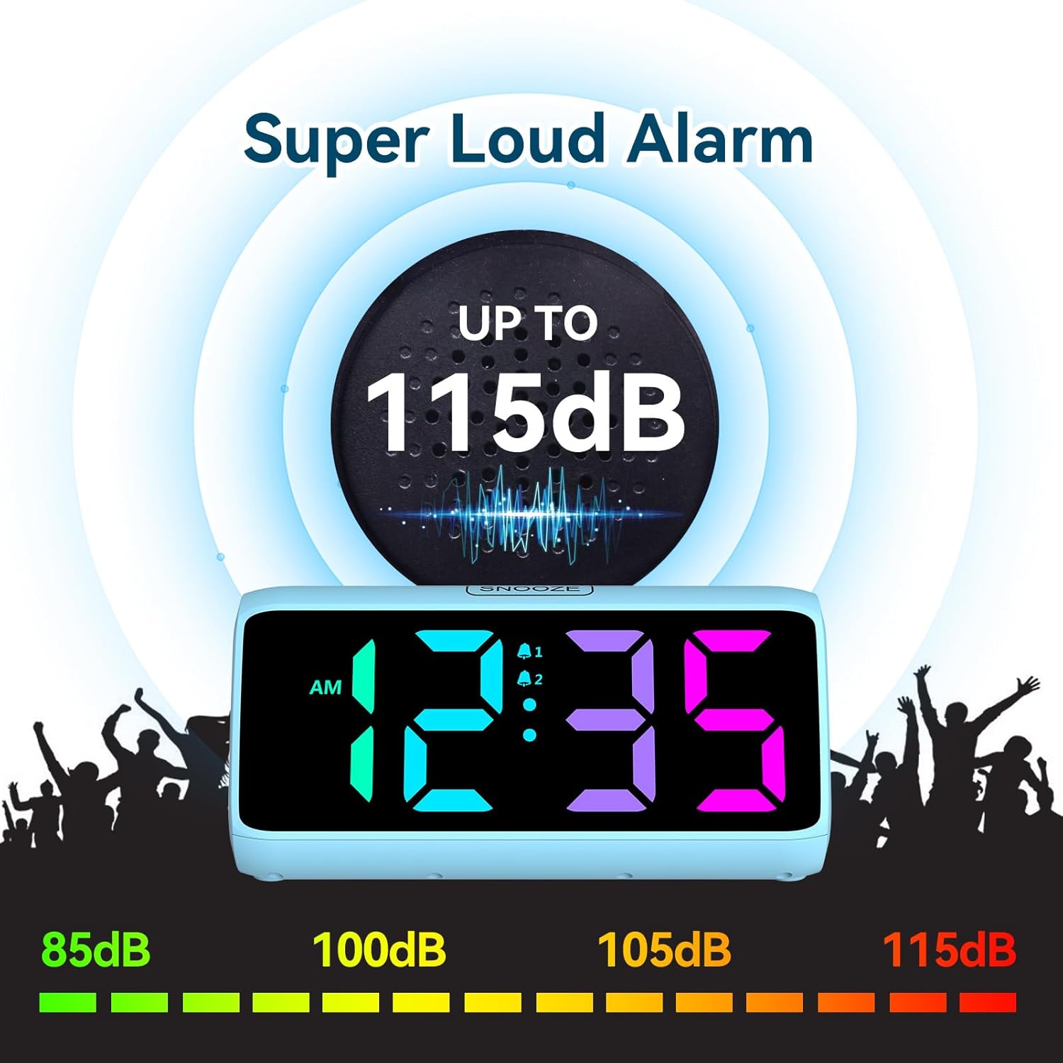 Netzu Loud Alarm Clock for Heavy Sleepers, RGB Alarm Clocks for Bedrooms Seniors Kids, Plug in Digital Clock with 5 Dimmers, 2 Alarms, 4 Volumes and Snooze