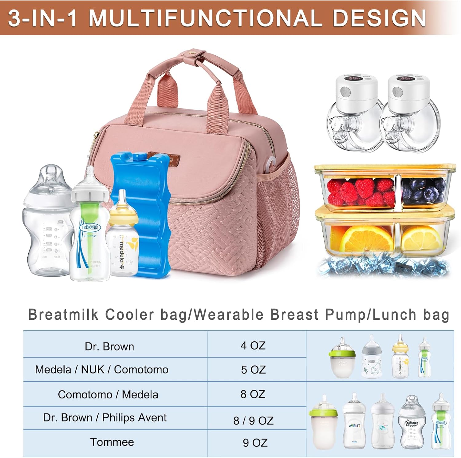 Breastmilk Cooler Bag with Ice Pack Fits 6 Baby Bottles up to 9 Ounce, Wearable Breast Pumps Cooler Bag for Nursing Mom Daycare, Work, Travel- Pink