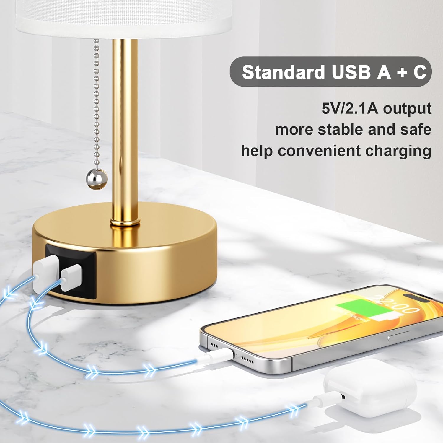 - 2. USB-A & USB-C Charging Ports - Power 2 devices at once side table lamp! With added feature of 2 usb sockets (5V/2.1A) on the bedside lamp, it get your phones, pad, laptops, humidifier, kindle, headsets, speaker, earbuds and other electronics fully charged all from the night stand lamp for room no matter if the bedroom nightstand lamp is on or off.