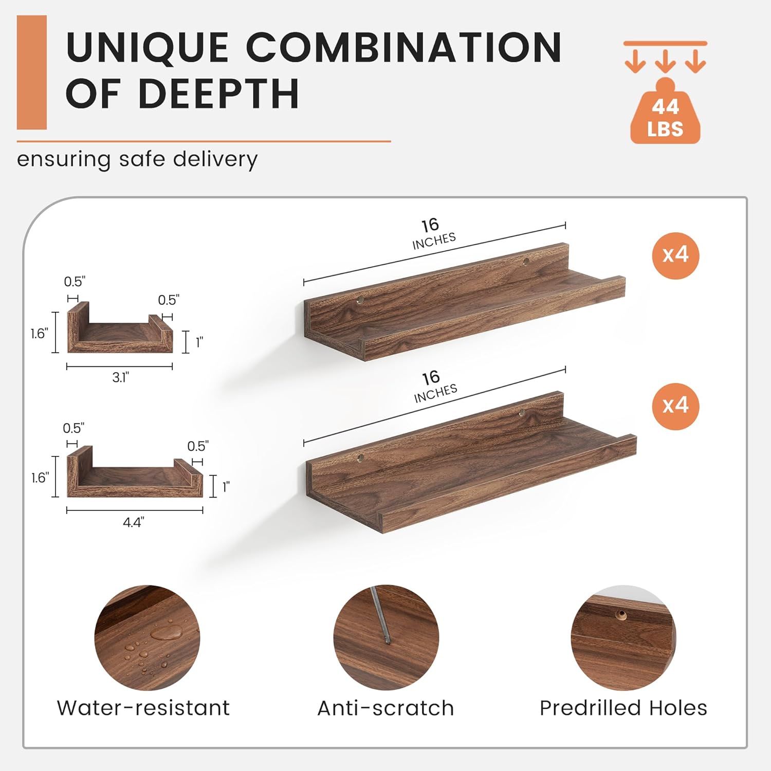 Floating Picture Ledge Shelves for Wall Set of 8, 16 Inch Wall Shelves with Lip Long Large Nursery Book Shelf for Toys Storage Kids Bookshelf Wall Mounted Living Room Bedroom Decor Frames