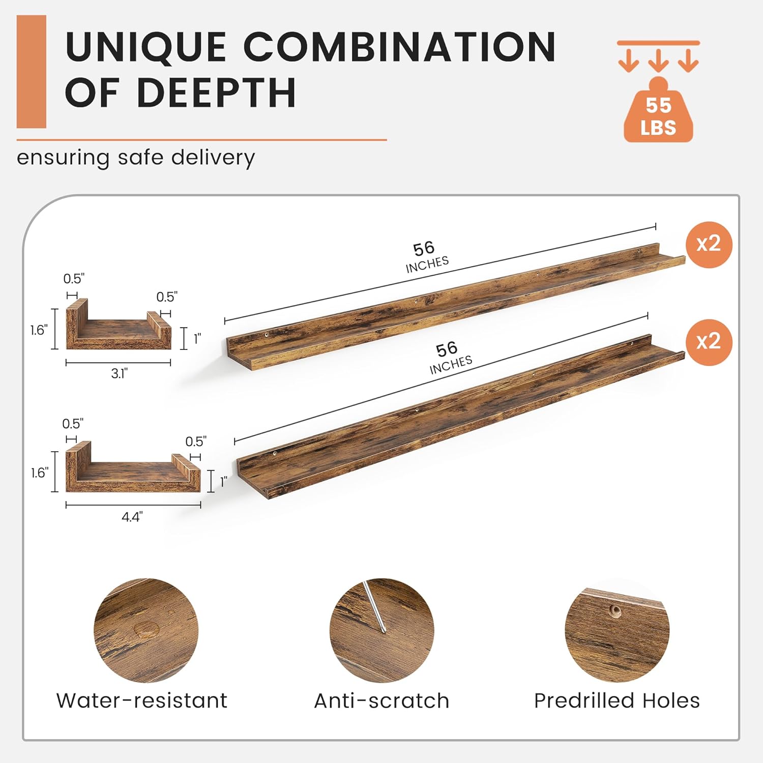 Floating Picture Ledge Shelves Set of 4, 56 Inch Long Large Nursery Book Shelf for Toys Storage Kids Bookshelf Wall Mounted Living Room Bedroom Decor Frames