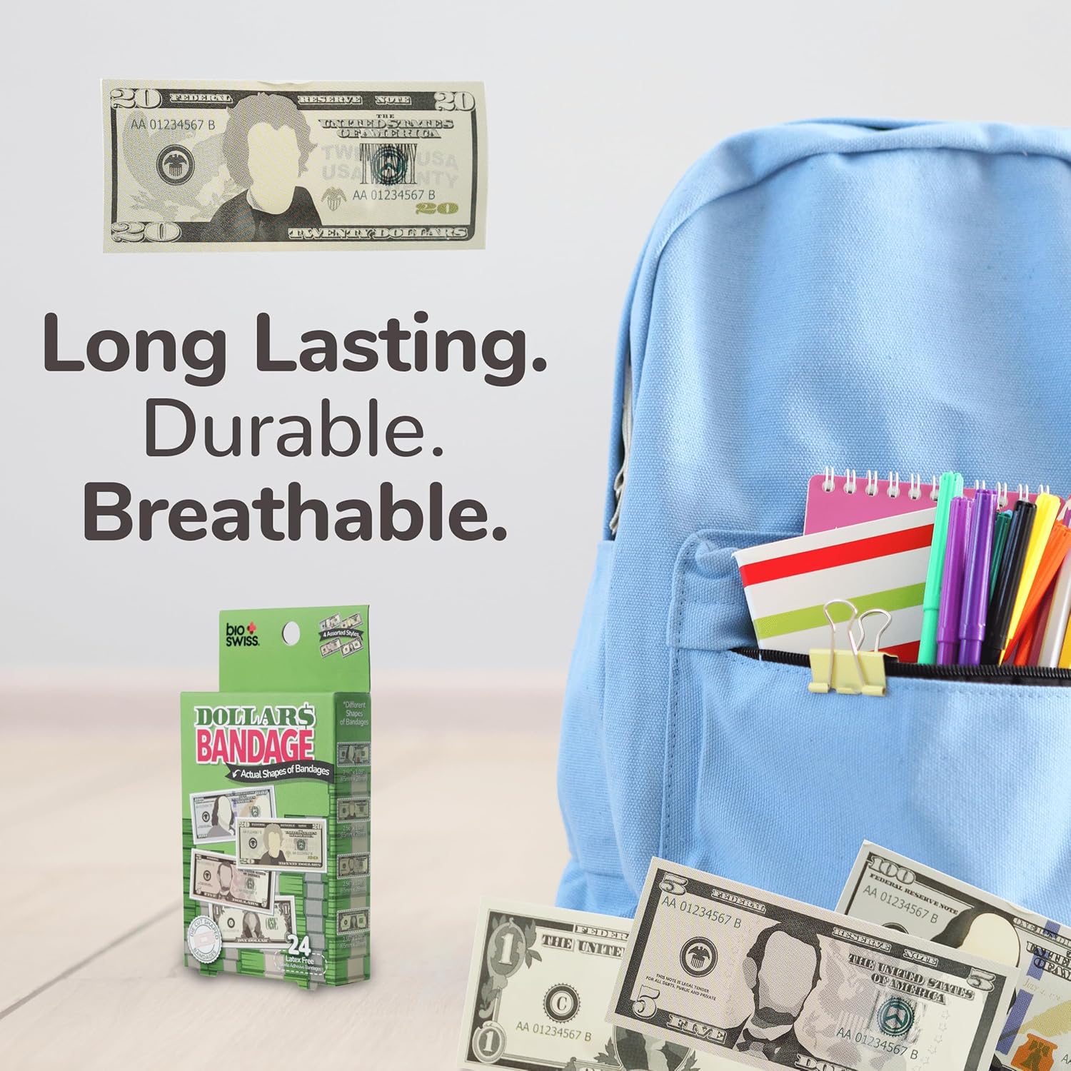 BioSwiss Bandages, Money Shaped Self Adhesive Bandage, Latex Free Sterile Wound Care, Fun First Aid Kit Supplies for Kids, 24 Count