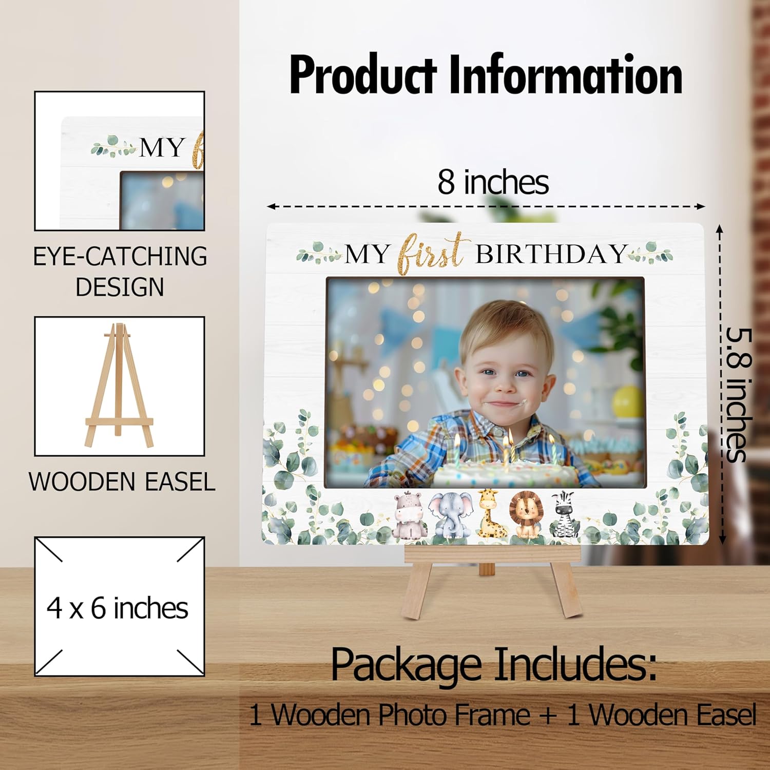 My 1st Birthday Picture Frames, Safari Animal Wooden 4x6 Photo Frame with Easel, Baby Wild One Birthday Gifts for Home Office Tabletop Display Decorations - G03