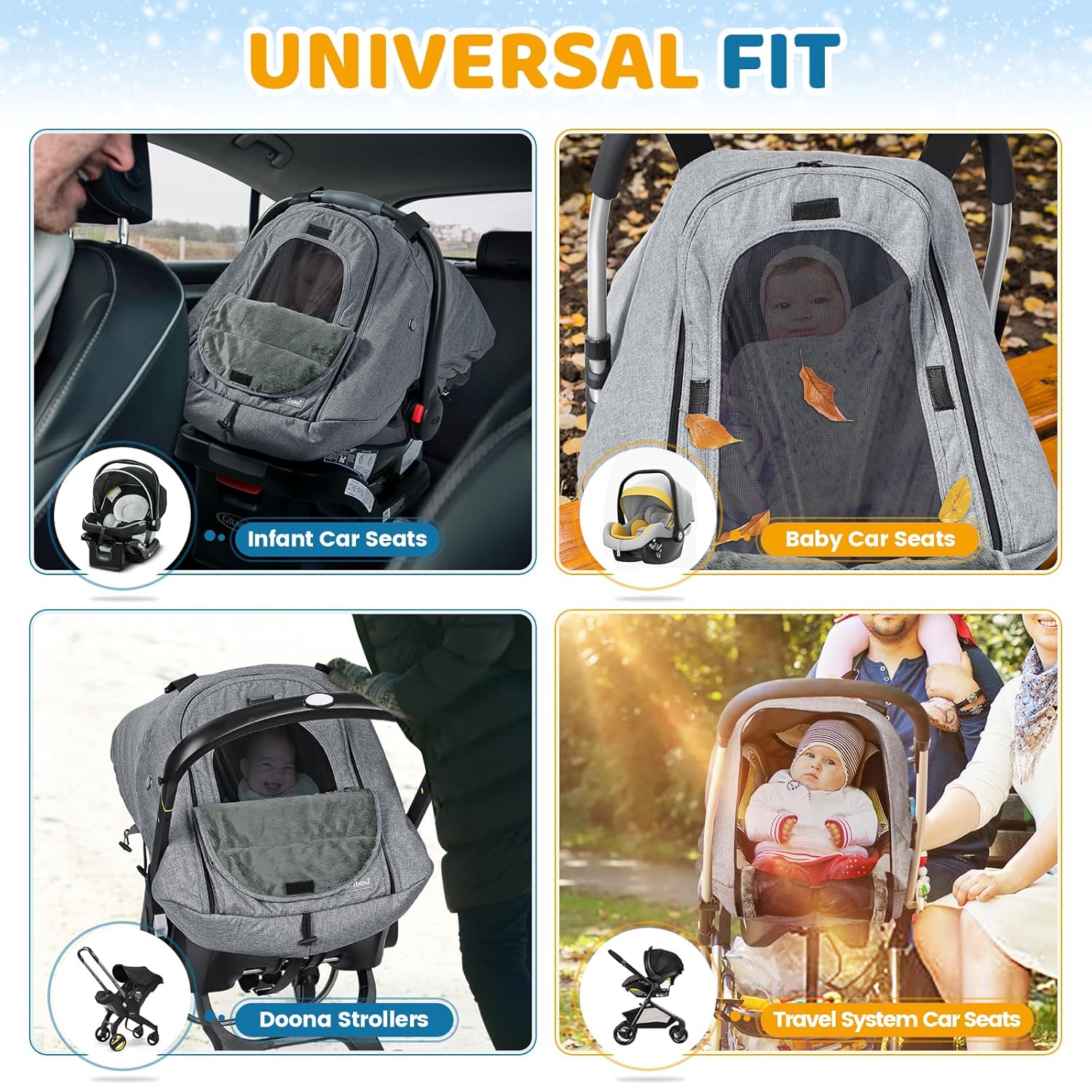 - Universal Compatibility: Elastic hem design fits most car seat carriers including compatible with Doona strollers; Secure adjustable nylon buckles prevent sliding during travel. Provides shade as car seat canopy and sun protection for strollers
