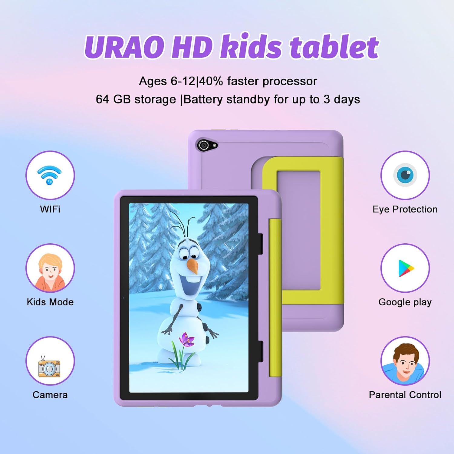 - 【NEW EDITION KIDS TABLET 10 INCH WITH CASE INCLUDED】Latest Version 10'' Kids Tablet for kids 6-12. URAO Kids Tablet is equipped with the latest operating system Android 14.0 which is safer and faster than the previous android versions and it can also eliminate unwanted ads. Besides, our kids tablet adopt 2.0 GHz octa-core processor that is 40% faster than normal processor on basic frequency. 8GB RAM, 64GB ROM and includes a micro SD card slot, you can easily expand the storage space up to 1TB with a micro SD card (not included).Large storage space allows children to enjoy a high-speed online world!