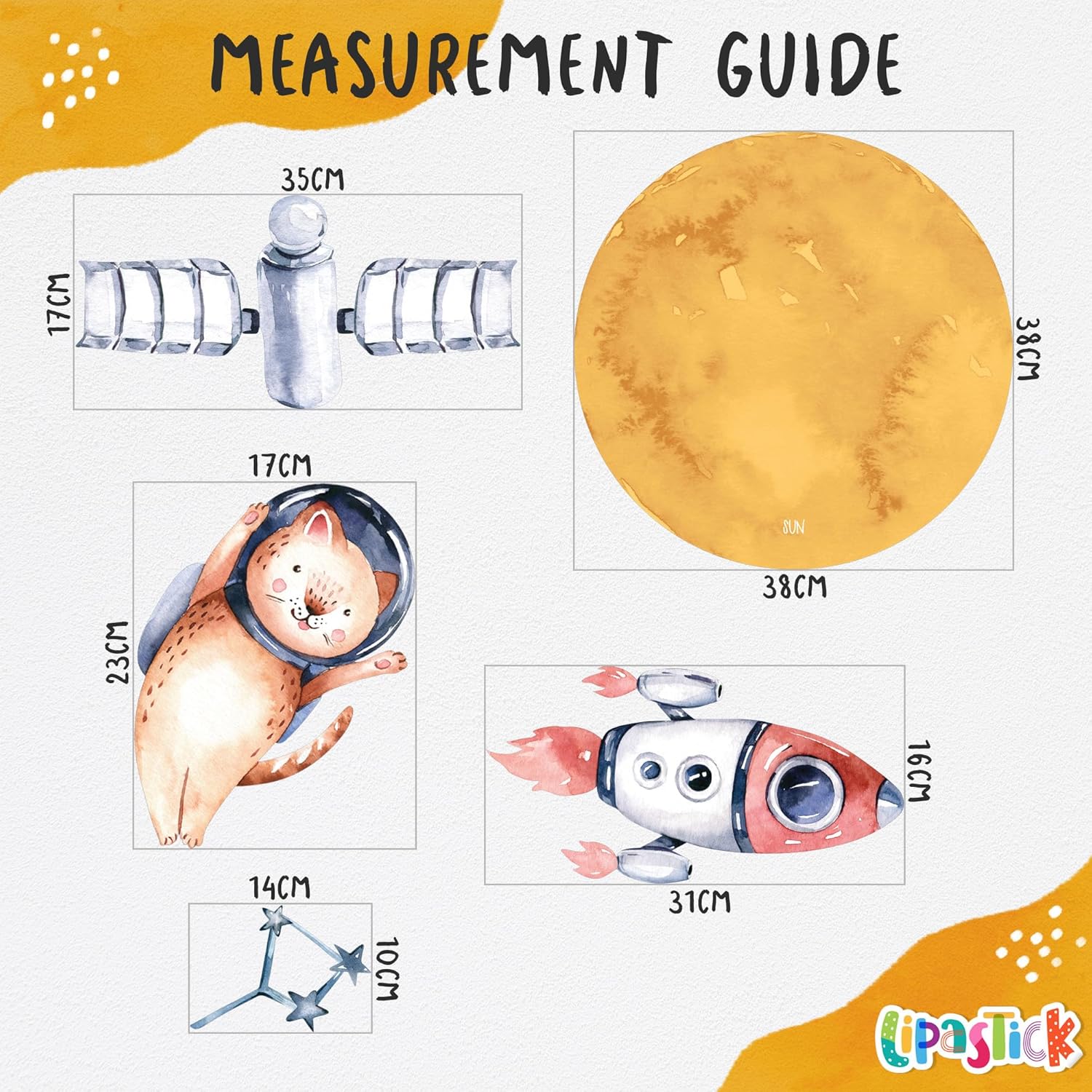 - 🌕 Package Content: Solar system wall decals for baby room come in a pack of 3 sheets. Includes: sun, planets, satellite, spaceship, rockets, astronaut animals, asteroids, stars and constellations. The sheet size is 31.4" x 15.7". This set of stickers is size L and its finished size is 100" x 59”. Perfect for covering large spaces.