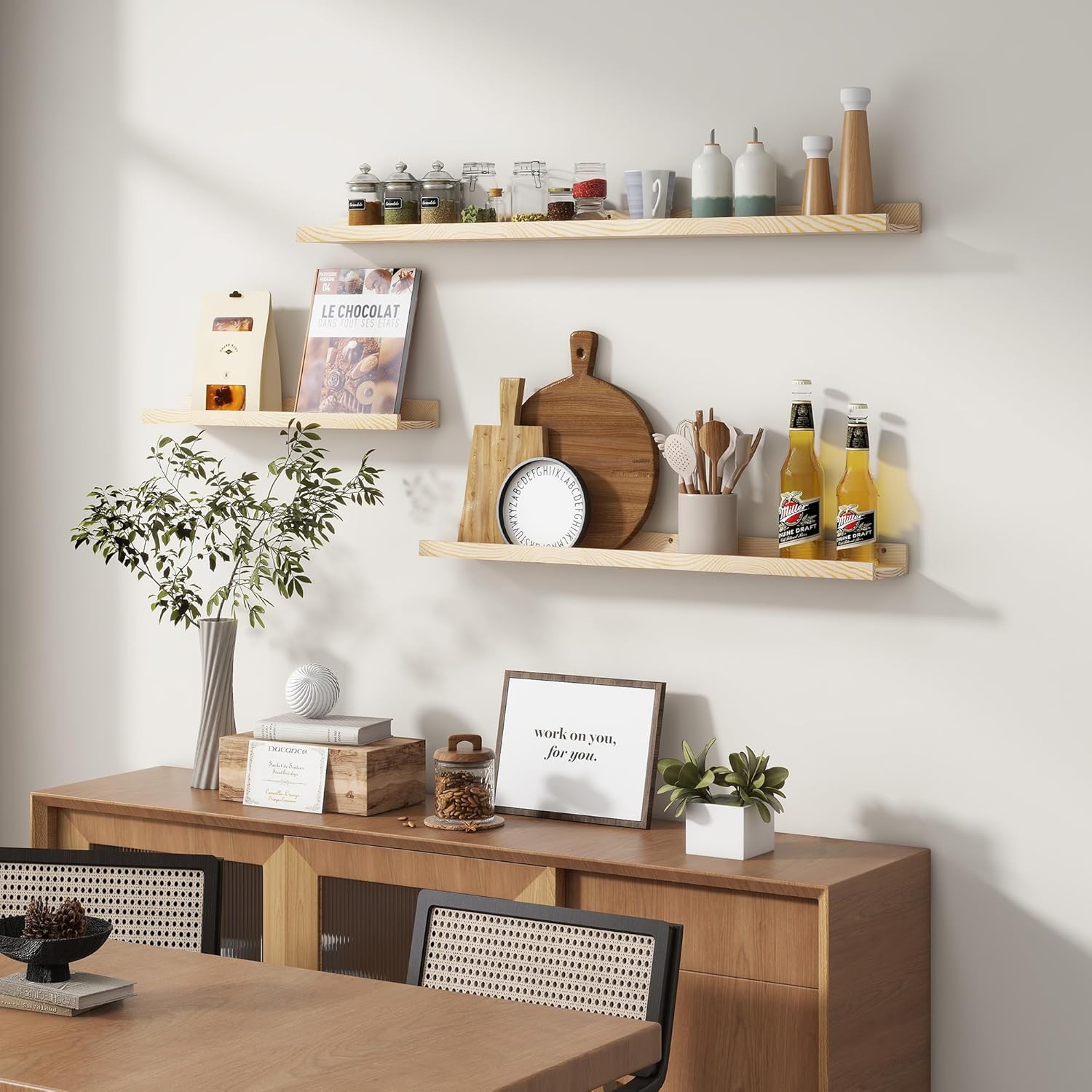 Picture Ledge Shelf for Wall, 48 inches Solid Pine Wood Nursery Book Shelves 3 Packs, Floating Ledge Shelves for Kids' Room Bedroom Bathroom Long Floating Shelves for Wall Nursey Wall Decor, Natural