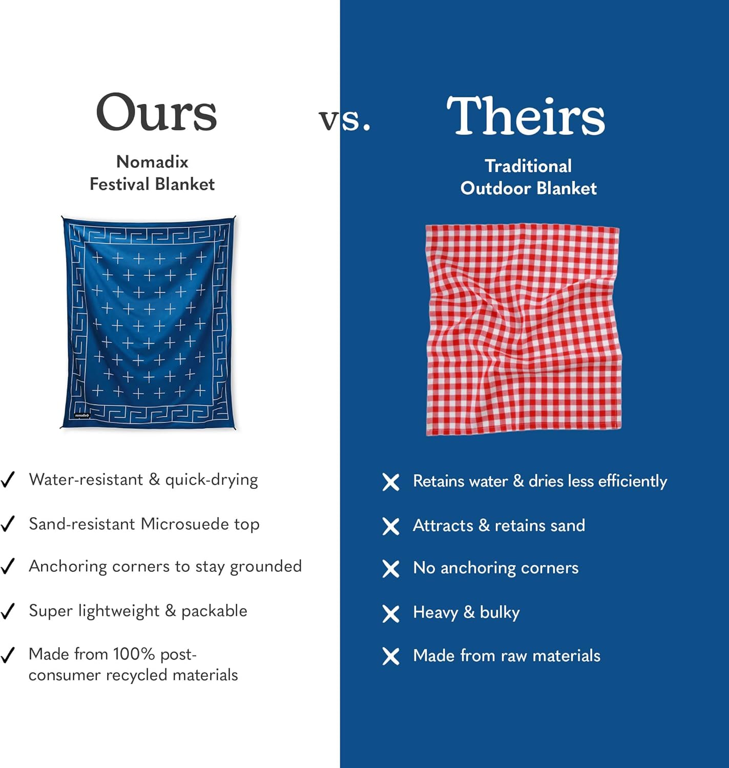 - Made With Post-Consumer Recycled Materials: We aren't using virgin plastic to make our products. We source already used plastics to build our festival blankets.