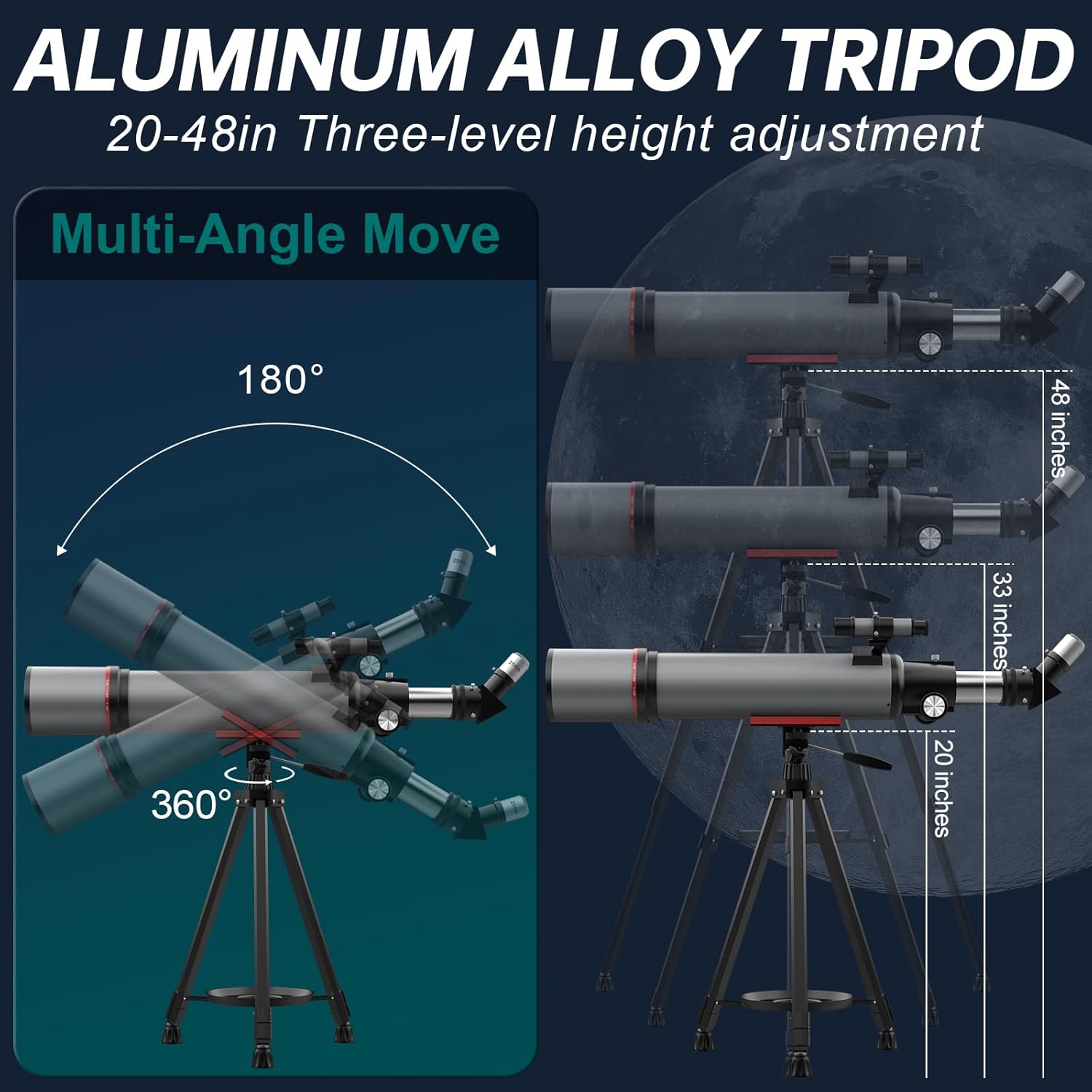 - Sturdy Tripod, Phone Adapter & Wireless Remote - Our telescope for adults is equipped with a stable tripod. The tripod is made of thick stainless steel, which is more stable and not easy to shake. The adjustable tripod can extend from 20 inch to 48 inch. With the phone adapter and wireless remote, that can help you explore the nature of the world easily through the screen and you can take some amazing images.