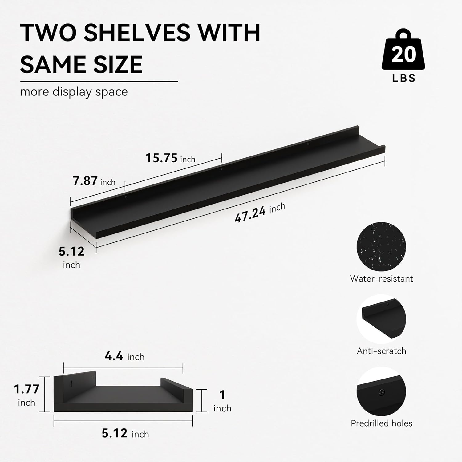 - Sturdy Wall Storage - Crafted from high-quality engineered wood, these shelves are designed to hold up to 20 lbs of art pieces. With dimensions of 5.1"D x 47.24 "W x 1.8"H, these shelves provide practical solutions for wall organization while complementing any decor style, from modern to traditional, rustic to contemporary.
