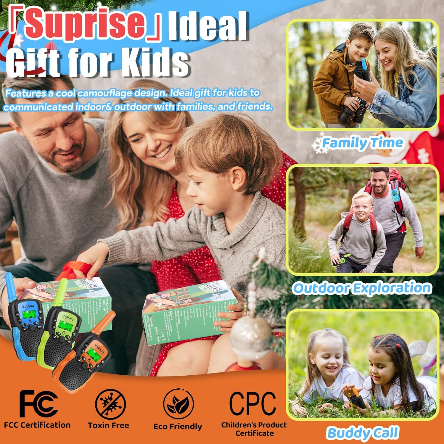 - Perfect Gifts Toys for Kids: Vvinca 3 packs walkie talkies for kids rechargeable are designed with a unique look. The Colorful kids walkie talkies are great choices as toys for boys and girls ages 3-12, it is as ideal birthday gifts, Christmas gifts, or other holiday gifts for children. Allows them to enjoy the fun of communicating, and playing with their families and good friends, suitable for indoors, hiking, camping, and other outdoor exploration.