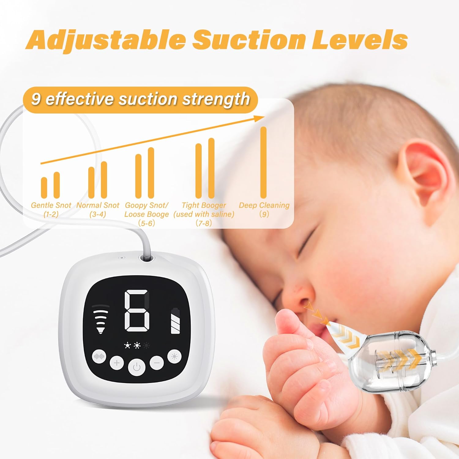 - [Soothing Functions]: Features a lullaby and soothing night light to create a calming environment during nasal aspiration for your baby. 3 brightness night light and 4 levels of lullaby volume adjustment.