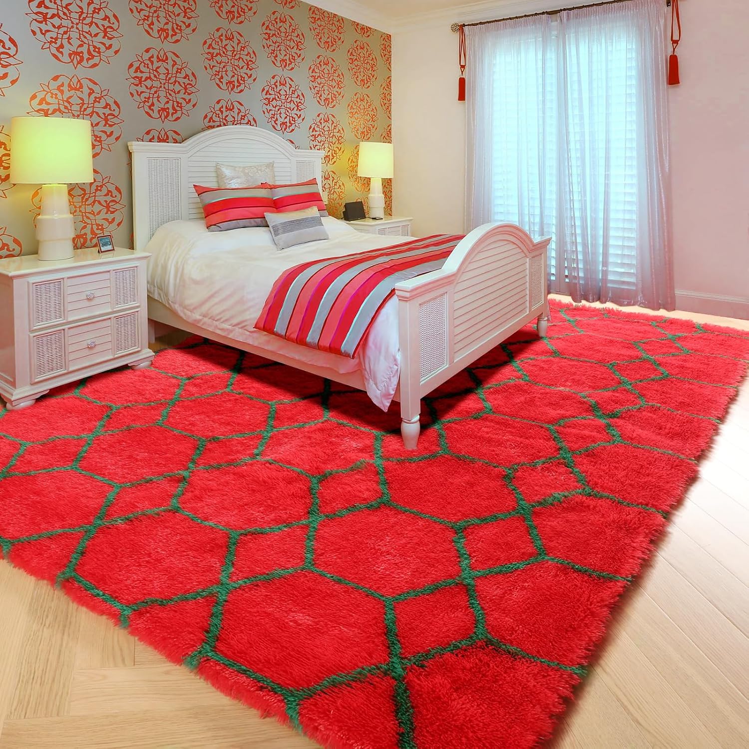 ONASAR Area Rugs for Living Room Bedroom, 5x8 Washable Fluffy Red and Dark Green Rug, Geometric Boho Soft Plush Shaggy Fuzzy Floor Carpet for Nursery Kids Girls Boys Teen Dorm Home Decor Aesthetic