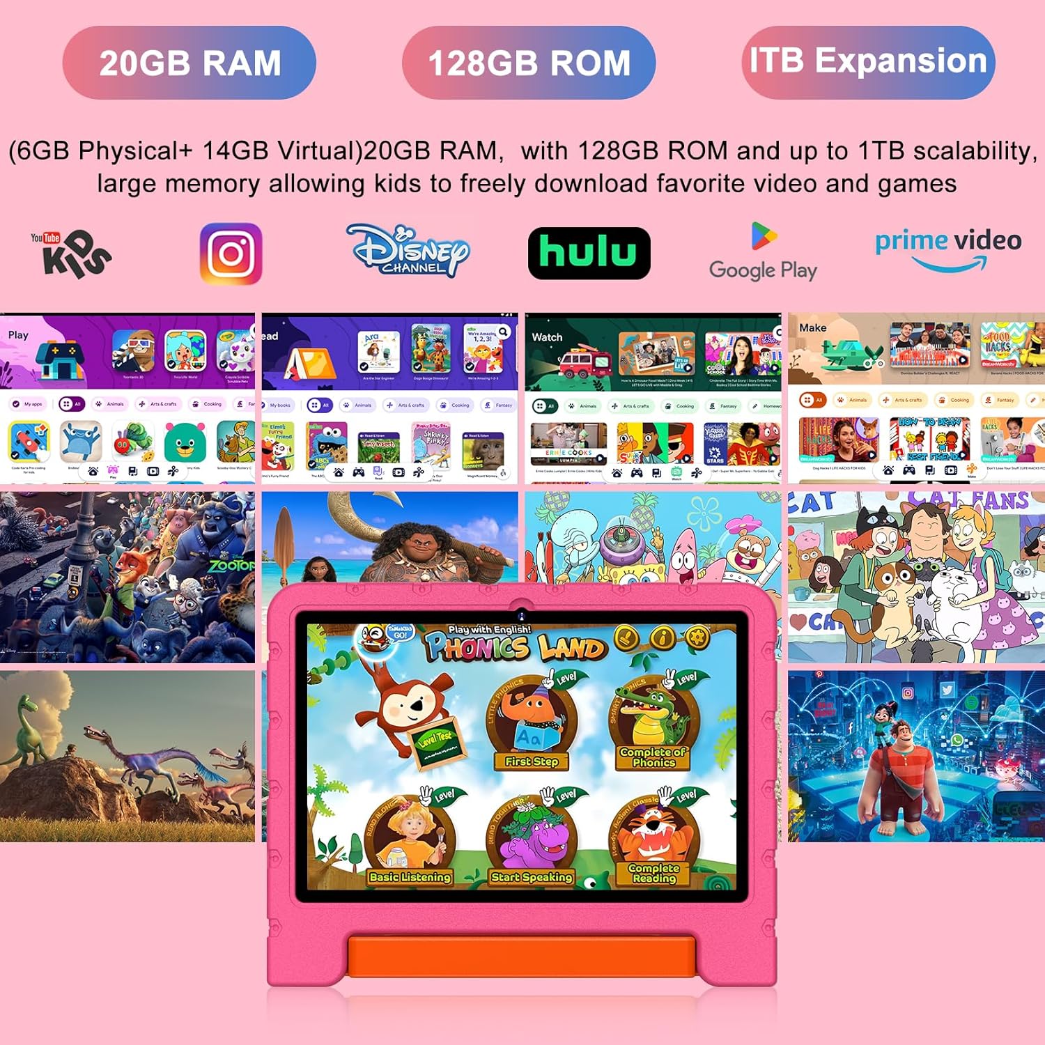 - 【20GB (6+14) RAM and 128GB Super ROM & 6000mAh Large Capacity Battery】 20GB ( 6GB Original + 14GB Expanded Virtual ) RAM + 128GB ROM (SD card expandable up to 1TB), it is able to run various apps compatibly and smoothly, and store your child's favorite movies, photos and apps, such as Kindle,Instagram,Disney+ and other daily required apps directly from the pre-installed play store to meet your child's diverse learning and entertainment needs. Let kids enjoy math, language, music, painting in the game. Equipped with a large 6000mAh battery, giving your child a stable and continuous use experience.