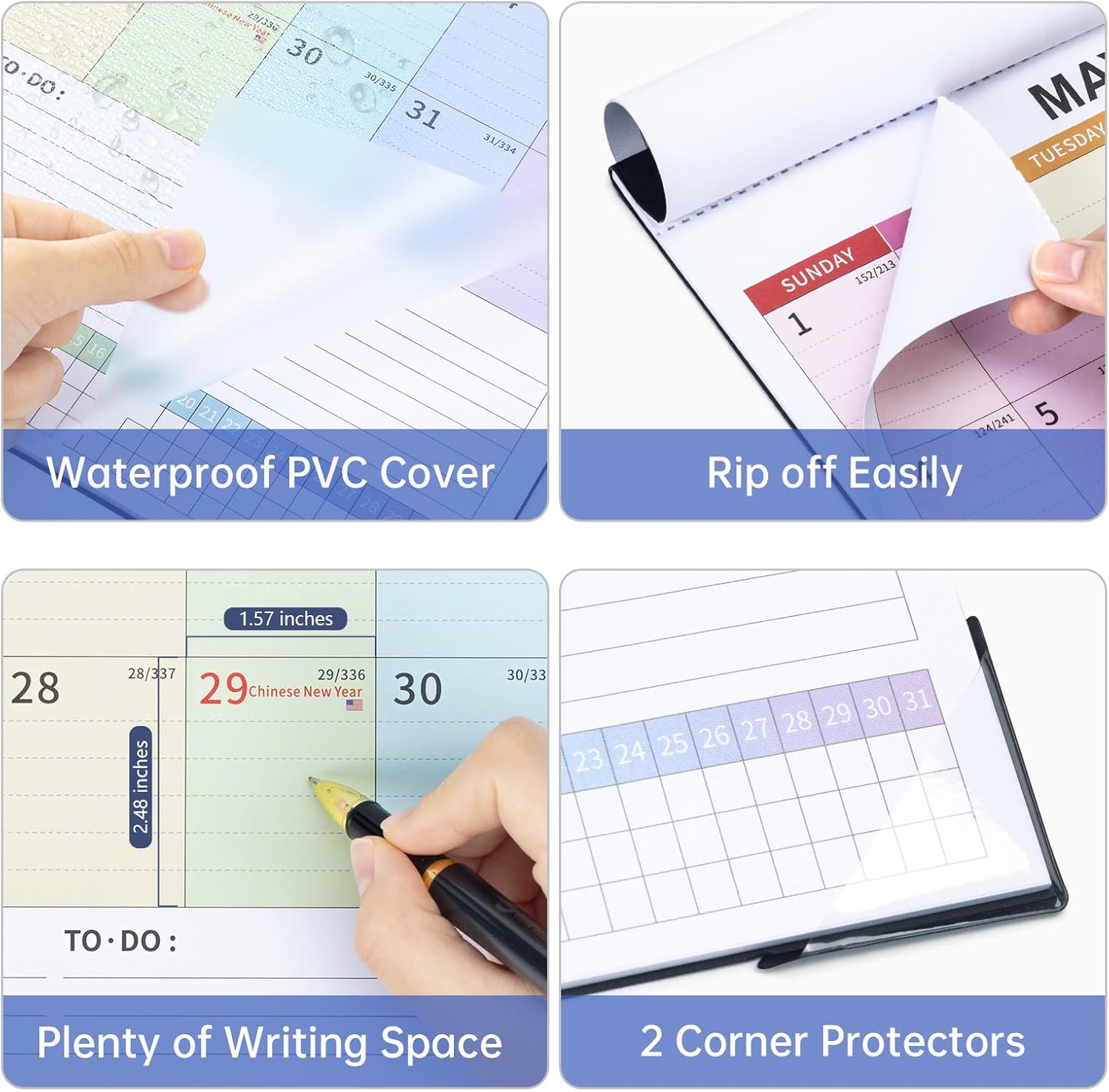 - Calendar Features: Thick paper resists ink seepage, ensuring clean and crisp writing. It comes with a transparent PVC cover to protect against dust and liquids, along with two corner protectors to keep the pages flat. The cutting line allows for effortless tearing of each month's page, making it perfect for long-term use as a wall calendar.