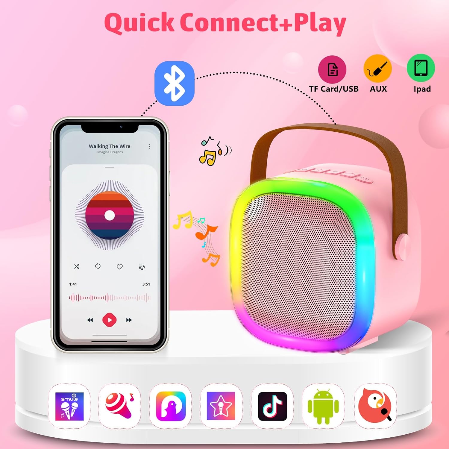 - Multi-Functional Karaoke Machine-Portable karaoke machine speaker comes with wireless microphone and LED lights.It comes with bluetooth connectivity, adjustable echo, Fun voice-changing effects, etc.Music can also be played via TF card, USB Port and AUX input. It’s suitable for kids of all ages and adults alike