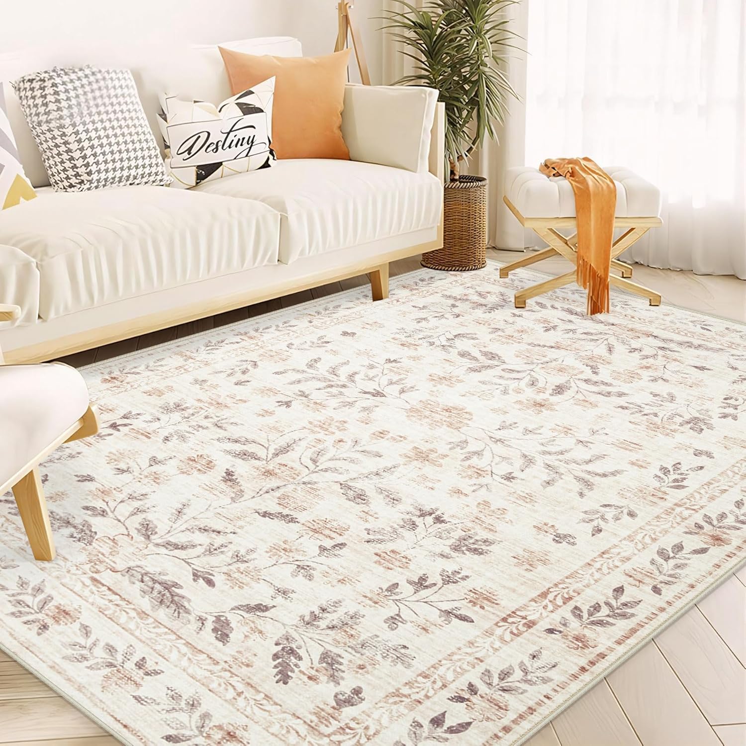 Rugs for Living Room 5x7 Rug, Washable Floral Boho Area Rug Non Slip Soft Low Pile Large Rugs for Bedroom Girls, Dining Room, Office, Kids Playroom(5'x7', Floral Beige)