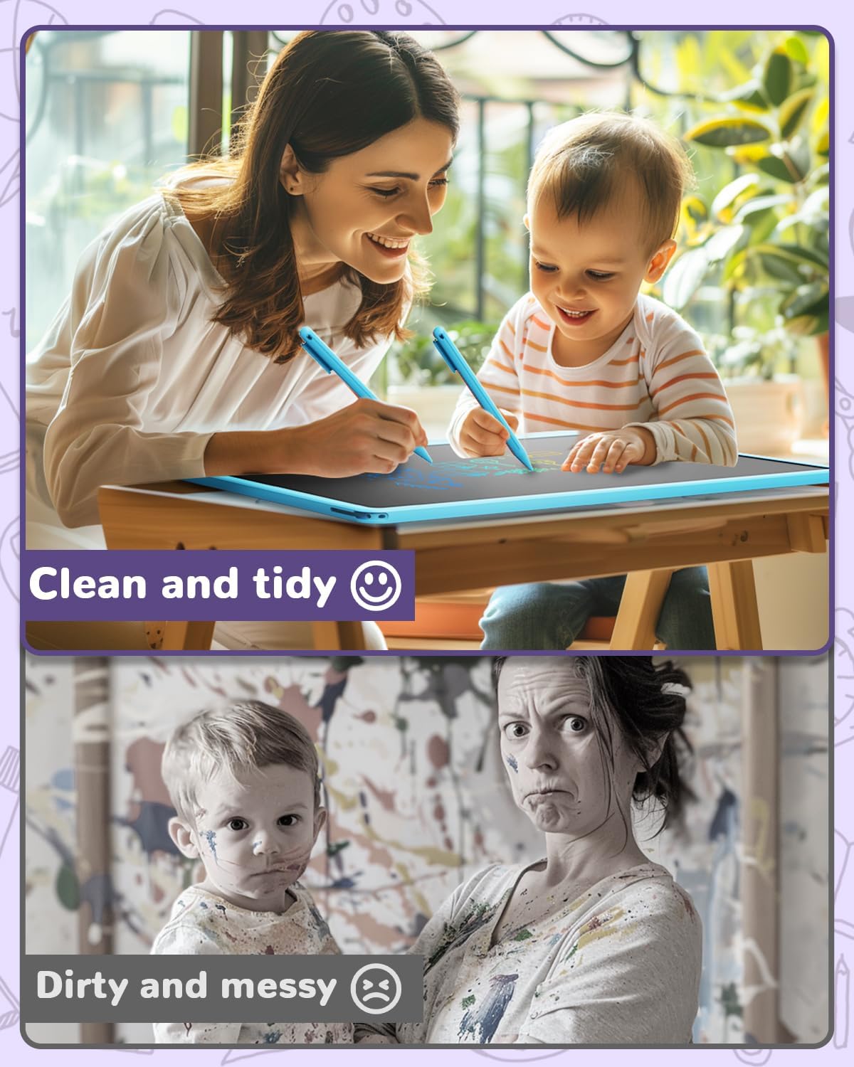- No Mess at Home: Built-in battery for the doodle board lasts up to 6 months, it's very easy to change in just a few seconds with your hands. The writing tablet can be reused 100000 times and reduce the money of paper, and the stylus can be hung on the writing board through the lanyard, you don’t need to worry about the stylus disappear, no mess at home
