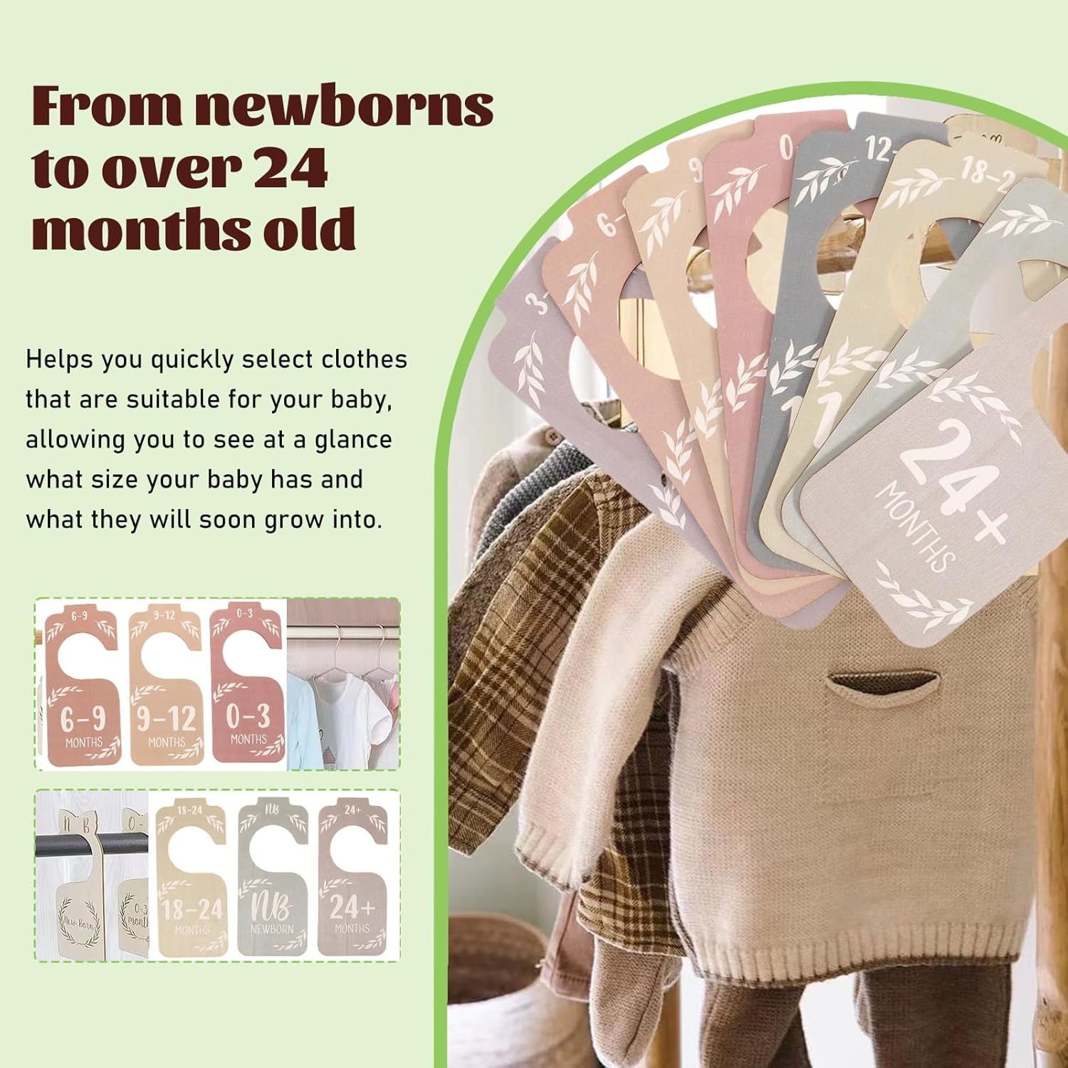 - Designs: The baby closet dividers make it super easy to stay organized and on top of all the baby clothes! Each set of baby clothes dividers has been printed with 8 different month numbers.Including 8 classifications: newborn, 0-3 months, 3-6months, 6-9months, 9-12months, 12-18months, 18-24months,24+months. This kind of design makes the dividers very efficient if you want to divide baby clothes for different months.