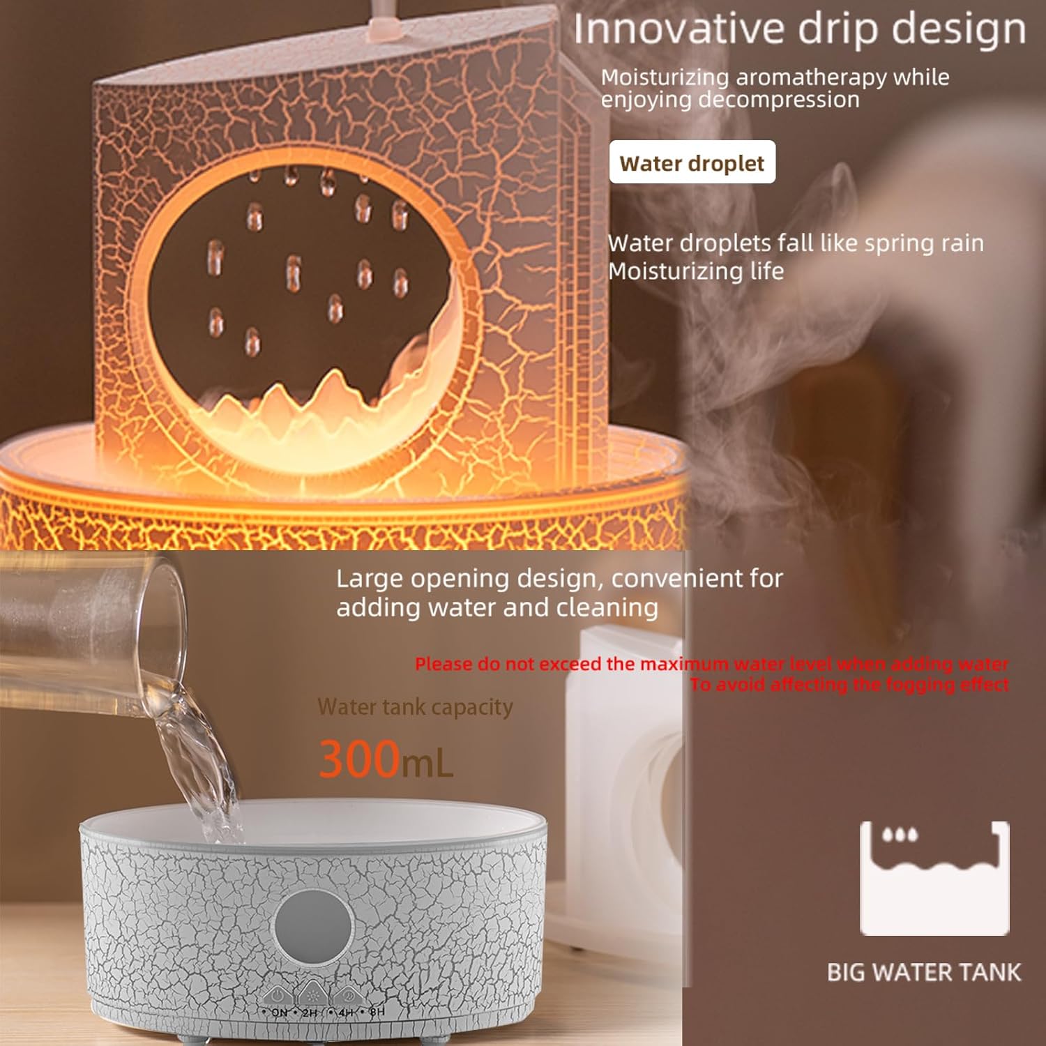 - The humidifier has four timer settings: The timing function is 2 hours/4 hours/8 hours/continuous.Each button has multiple functions and can be switched freely. The humidifier has a water tank of approximately 300ML, designed with a large diameter for easy water filling.In any mode, no water will automatically protect the shutdown.