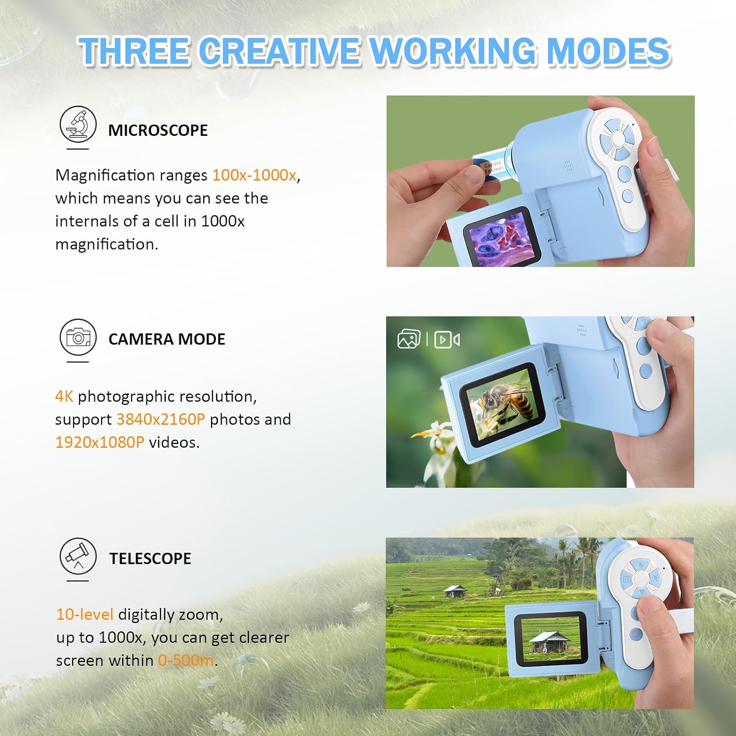 - 𝟯-𝗜𝗻-𝟭 𝗗𝗲𝘀𝗶𝗴𝗻: 1) Microscope Searching, 2) One-Click Photo & Video Recording, 3) Telescope, choose what you want to enhance child's learning experience. And this digital microscope made of 4K resolution, provides much higher clarity