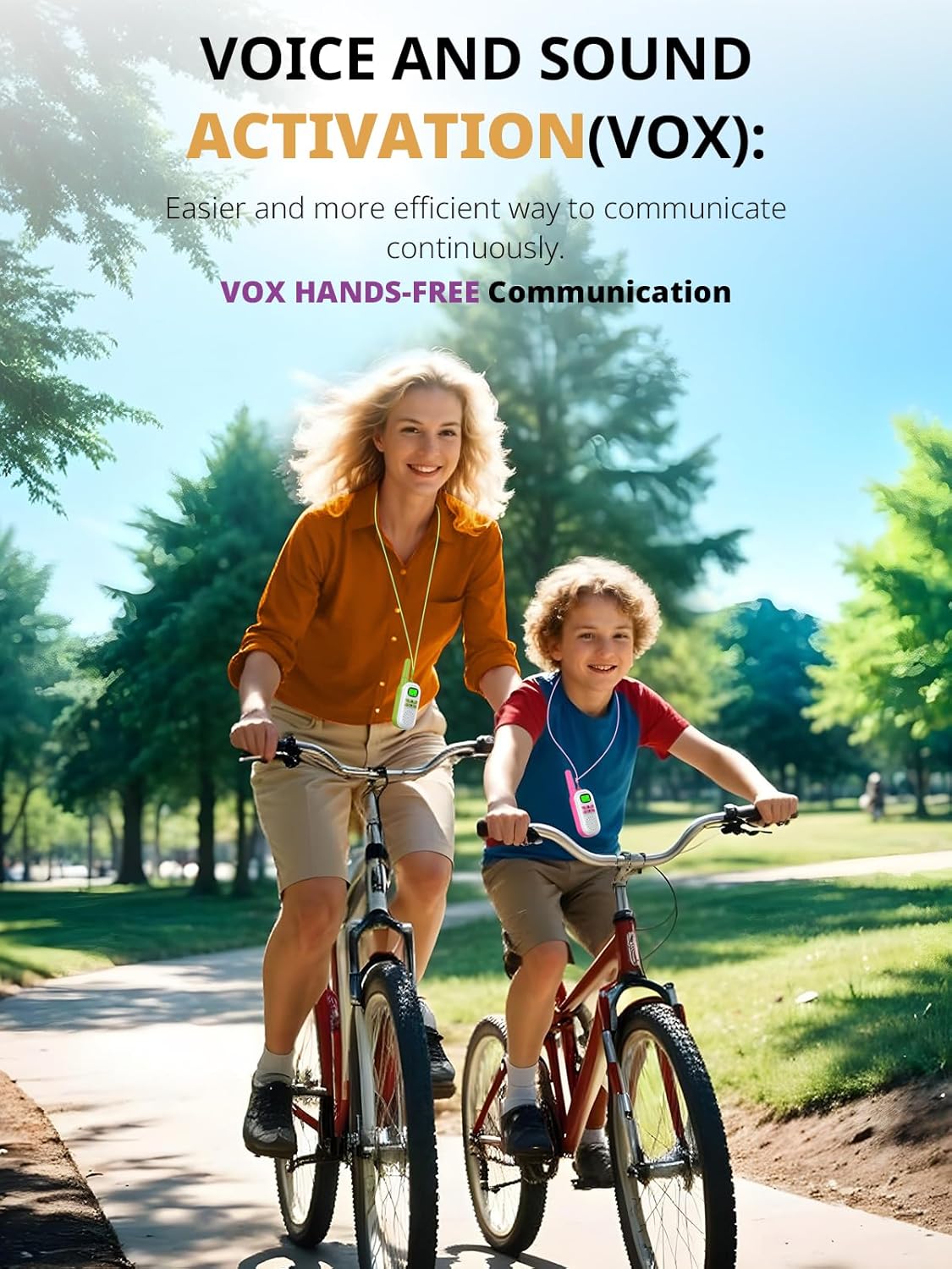 - Easy to use with hands-free VOX function, these walkie talkies feature a backlit LCD screen for visibility during both day and night. In addition to the push-to-talk feature, VOX mode allows kids to speak without pressing any buttons, which is great when riding bikes or playing outside.
