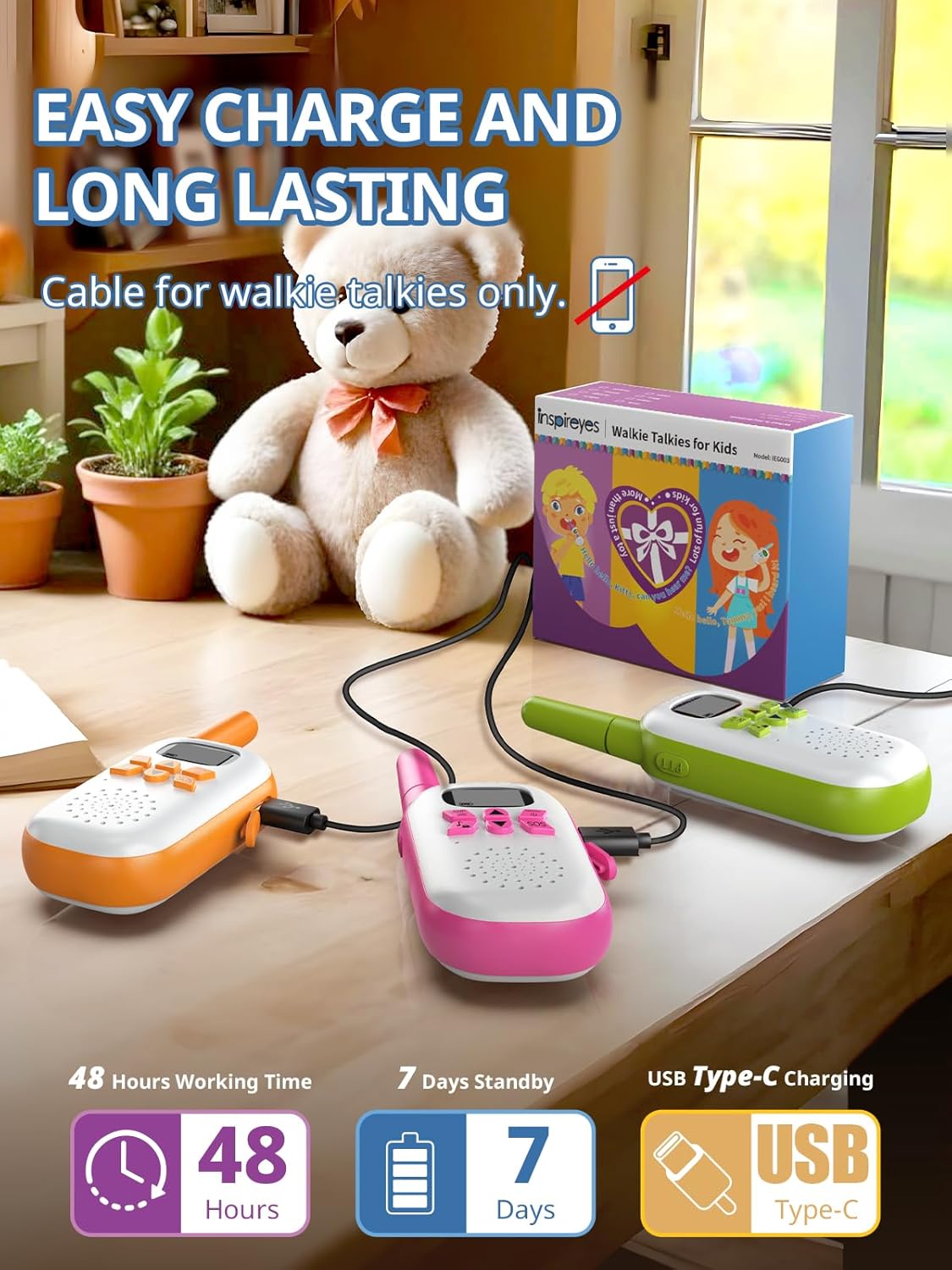 - Inspireyes rechargeable kids walkie talkies are rechargeable and long lasting, featuring an upgraded built-in lithium polymer battery. There is no need to buy extra AAA batteries. Kids can enjoy up to 48 hours of playtime and 7 days of standby on a single charge.