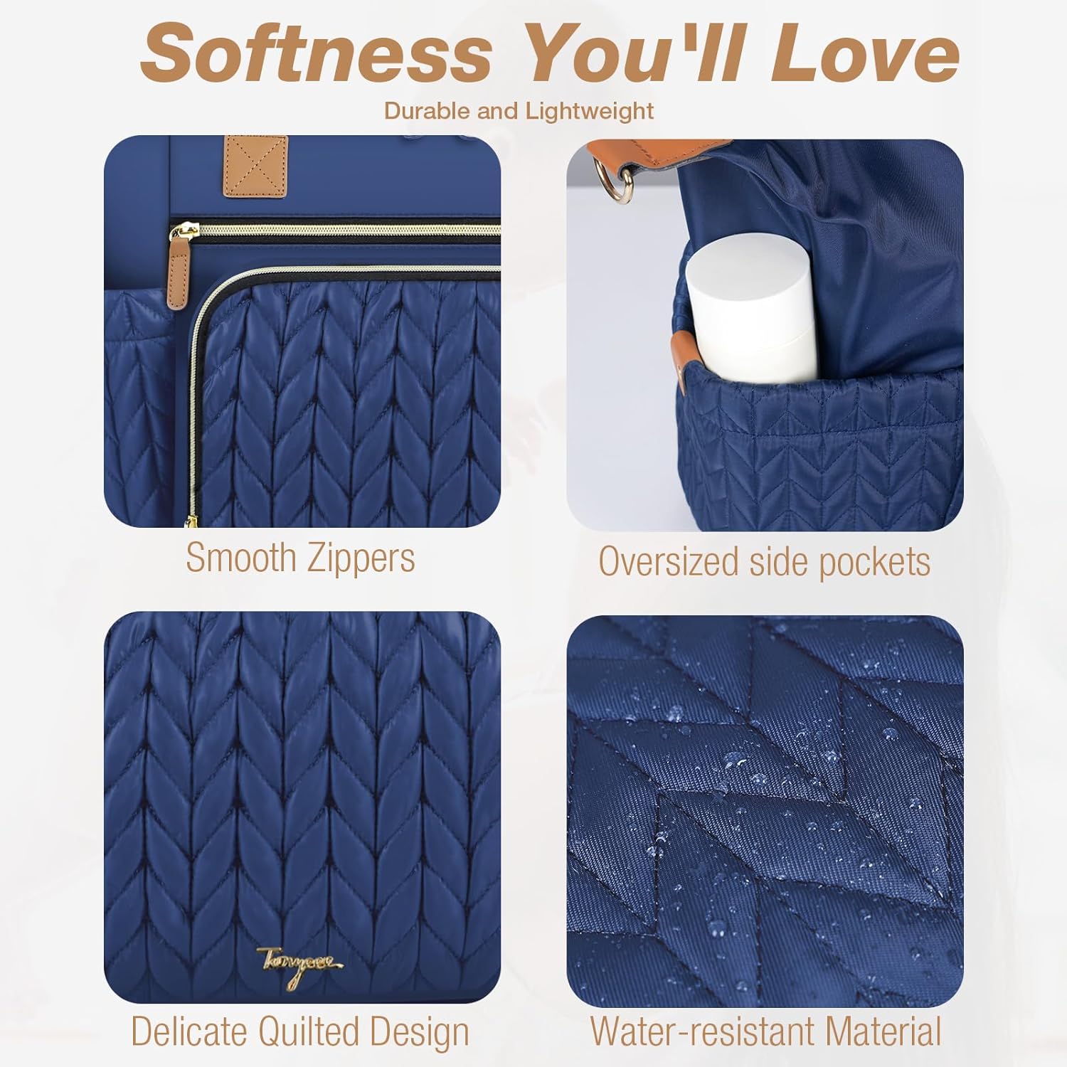 - Quilted Materials:Tonyeee diaper bag with 3D herringbone nylon quilting,achieve a perfect blend of practicality and fashion. While studded feet in the bottom keep the bag clean and off the ground