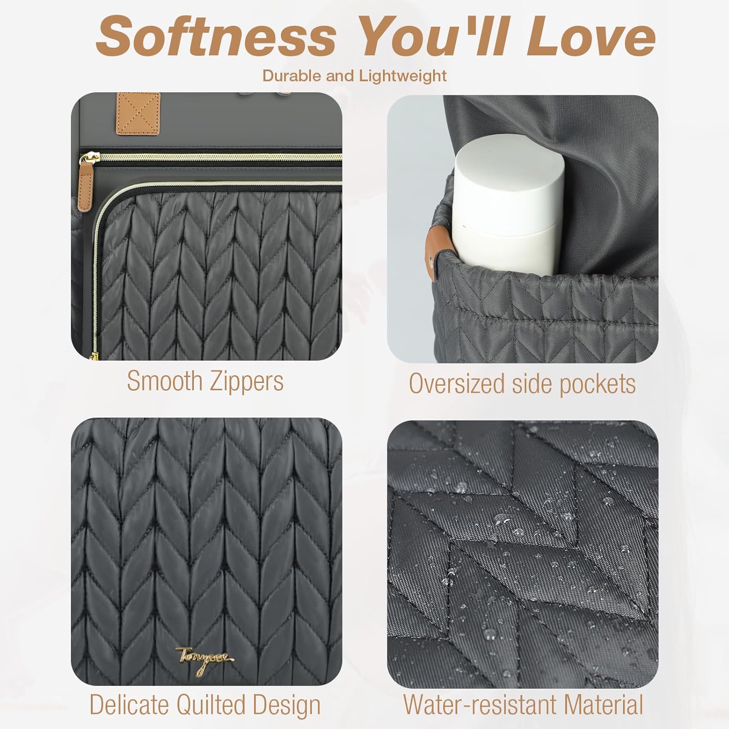 - Quilted Materials:Tonyeee diaper bag with 3D herringbone nylon quilting,achieve a perfect blend of practicality and fashion. While studded feet in the bottom keep the bag clean and off the ground