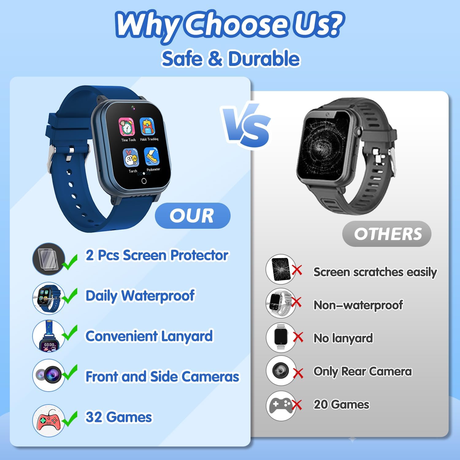 Kids Waterproof Smart Watch with 32 Games Dual Camera Music Player Pedometer Habit Tracking HD Screen Protectors Lanyard Flashlight Storybook, Smart Watch for Kid Birthday Gifts for 5-12 Year Olds Boy