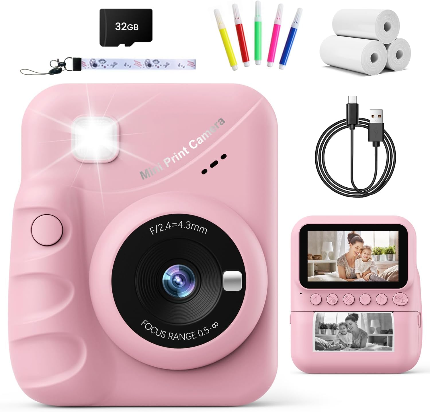 - TOYS FOR CHILDREN AGED 3-14: This toy camera is both a digital and instant camera. The design is compact and lightweight, and the buttons are simple to operate, making it easy for children to master. Package includes 3 rolls of printer paper, lanyard, charging cable, 32G card and color pens.