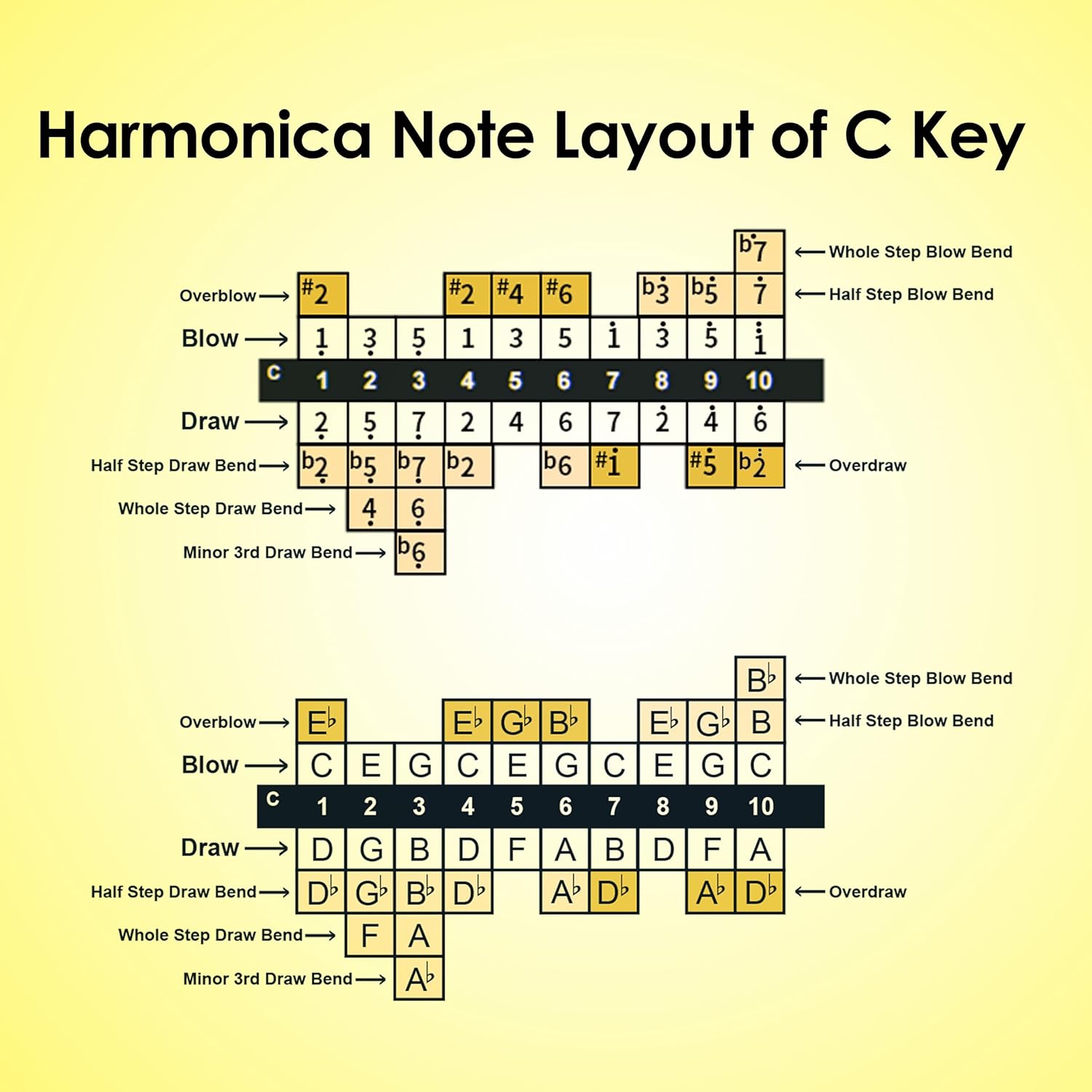 - 10 Holes Diatonic Harmonica: which features 10 holes with reeds tuned to the key of C. It's allowed to play a complete 7-note scale of the key.With advanced playing techniques, you can produce additional notes from outside the scale, adding depth and versatility to your music