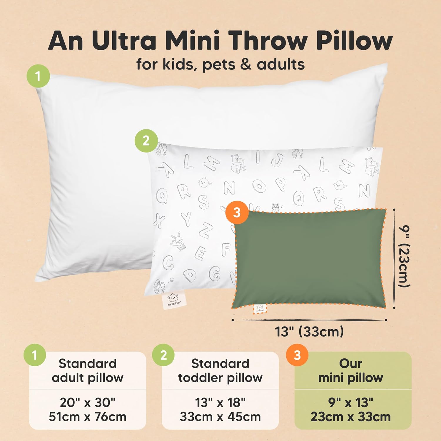 - Introducing the 9"x13" Mini Toddler Pillow - A spin-off from the wildly popular KeaBabies My Little Dreamy Toddler Pillow. This small pillow is ergonomically crafted for sleep, play, and travel, and is sure to become your child's new favorite pillow.