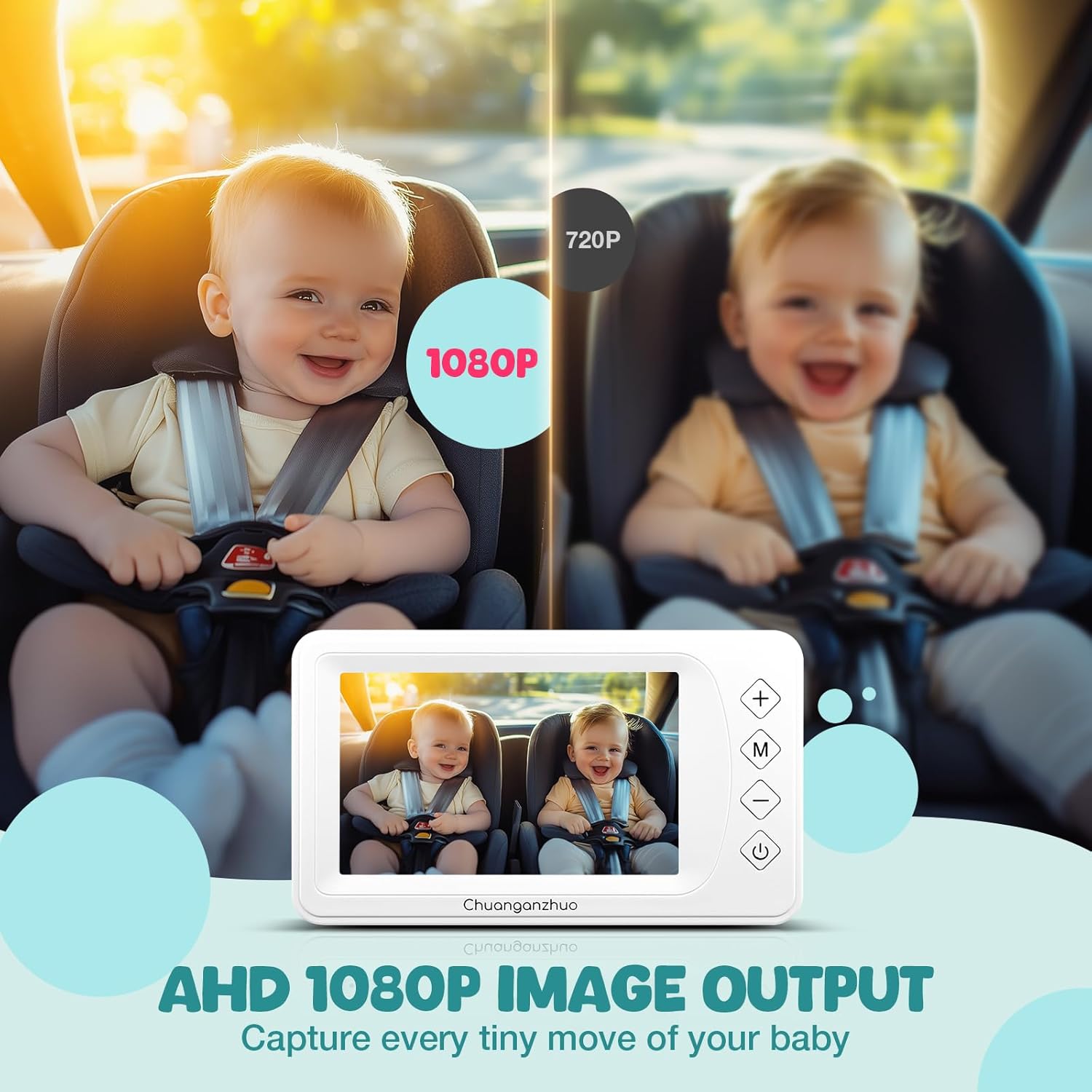 - 【5" AHD 1080P IPS Full-View Monitor】The 5-inch perfect size: bigger view than 4.3", neater than 7''. Our IPS full-view car baby monitor delivers clear, accurate images from any angle. Whether you're in the driver's or passenger seat, you'll enjoy an identical viewing experience. This AHD 1080P monitor with high pixel density precisely reproduces colors and contrasts, offering rich gradations, sharp light-dark differentiation, and vivid images to capture your baby's every movement