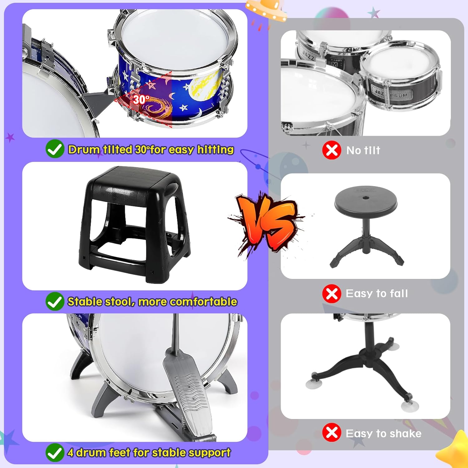 - Safe and Comfortable Design: This toddler drum set has a taller main stand and double-ply construction to prevent falling off. The drums are angled at 30° for easy play. All of this is designed to ensure stability and comfort for toddlers.