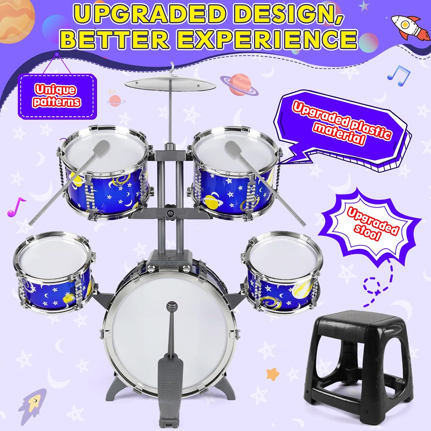 - Upgraded Beginner Drum Kit: Kids drum set made of plastic and alloy, with 5 drums, 1 cymbals, 2 drumsticks and 1 sturdy stool. Complete accessories for beginners to practice.