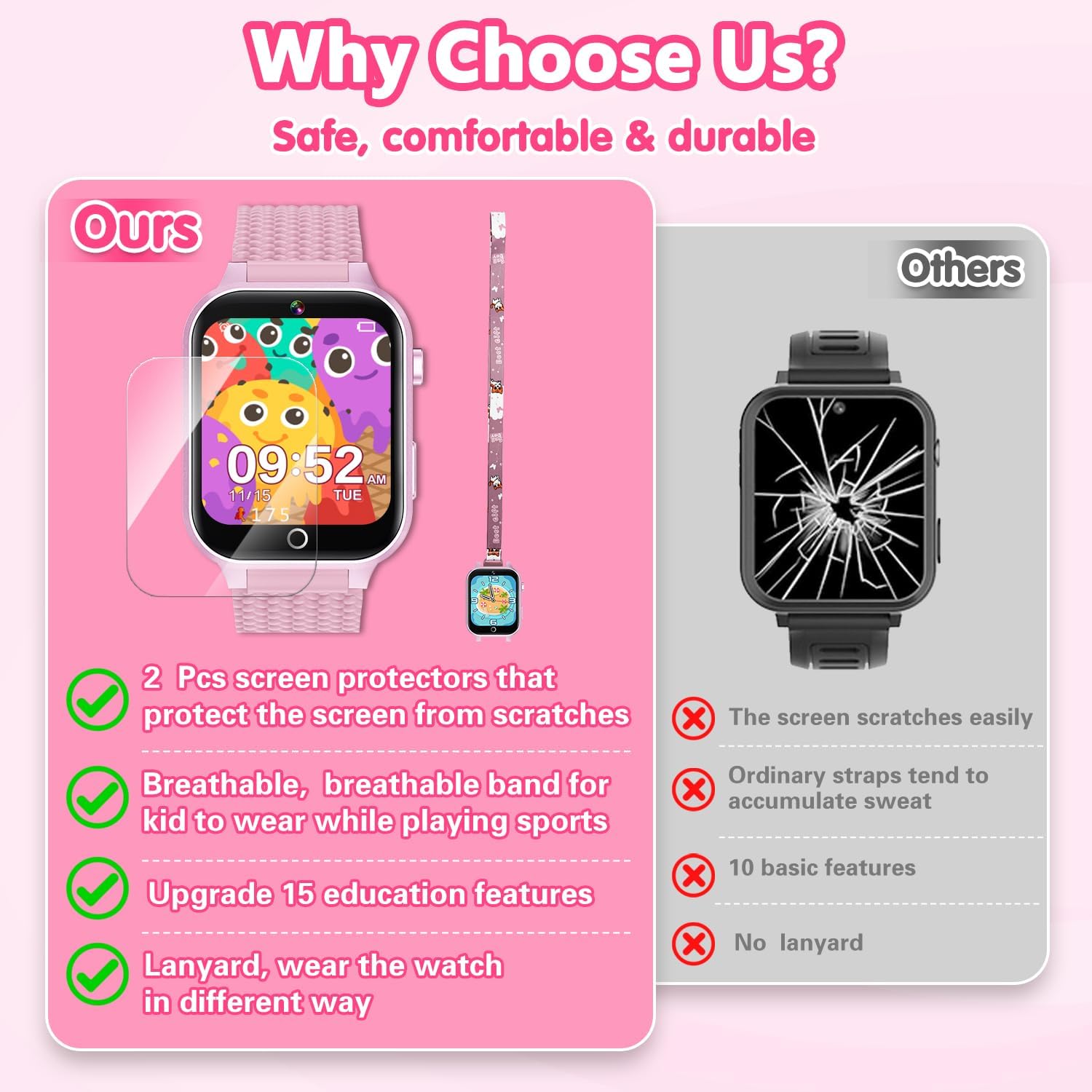 - 【Durability and Usability】Designed with 2 dual screen protectors to protect the kids watch from bumps and falls. It is also supplied with a lanyard that can be worn around the child's neck for added usability. Our watches for kids fecture a braided silicone band that is gentle on the skin, more slip-resistant and breathable.