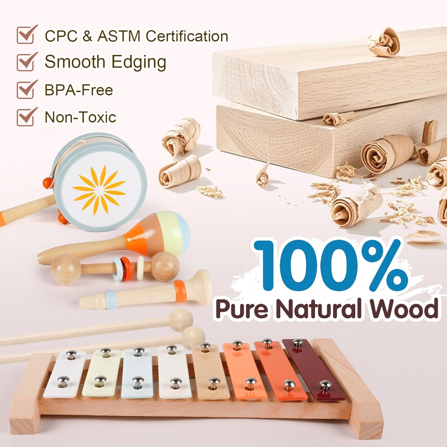- SAFE & DURABLE MONTESSORI BABY MUSICAL INSTRUMENTS FOR TODDLERS 1-3 - These wooden montessori toddler musical instruments are made of premium natural wood,organic pigments and environment friendly water-based paints which safe for your baby.The educational musical instruments set is smooth, rounded edges,no sharp edges,no harm to your baby boys girls,ensure your baby's safety and comfort.All of parts have passed CPC/ASTM Certified,baby musical instruments are a best preschool educational music learning toys.The sturdy construction will make our toddler musical instruments,durable and stable.