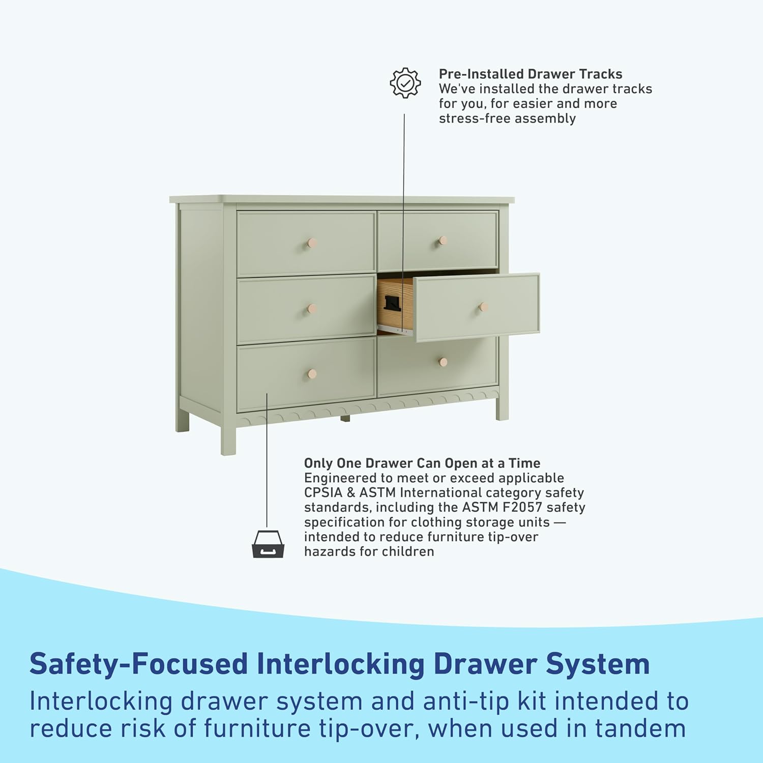 - INTERLOCKING DRAWER SYSTEM & FURNITURE TIP-OVER RESTRAINT KIT: For added safety, the Sasha 6 Drawer Dresser includes our innovative, safety-focused interlocking drawer system and furniture tip-over restraint kit, intended to mitigate the risk of furniture tip-over when used in tandem