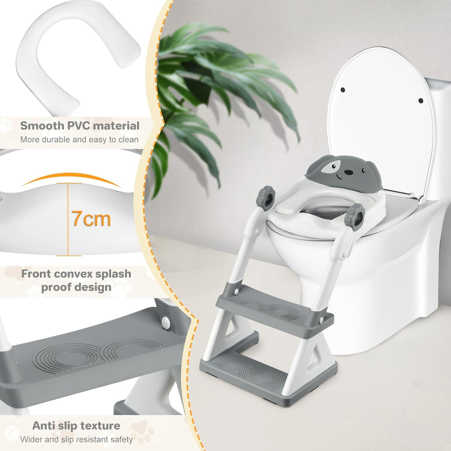 - Height Adjustment&PU Seat Cushion:You can easily adjusting the kids toilet ladder height from 15" to 17.2" for a perfect fit, it equipped with a waterproof soft PU seat cushion, which has good resilience and soft touch, protecting children's delicate skin.