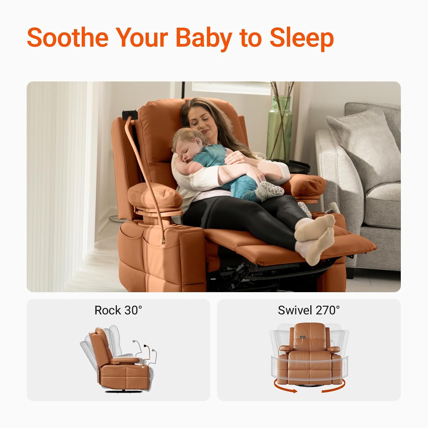 - Versatile Design with Practical Features: Our multifunctional nursery glider recliner is thoughtfully designed to offer a combination of comfort and functionality. Made with durable, soft silicone leather, it’s waterproof, stain-resistant, and pet-friendly. Armrest includes a built-in phone holder, two cup holders for bottles, USB and Type-C charging ports, and two side pockets to store wipes and tissues, making it the perfect choice for any nursery or living space.