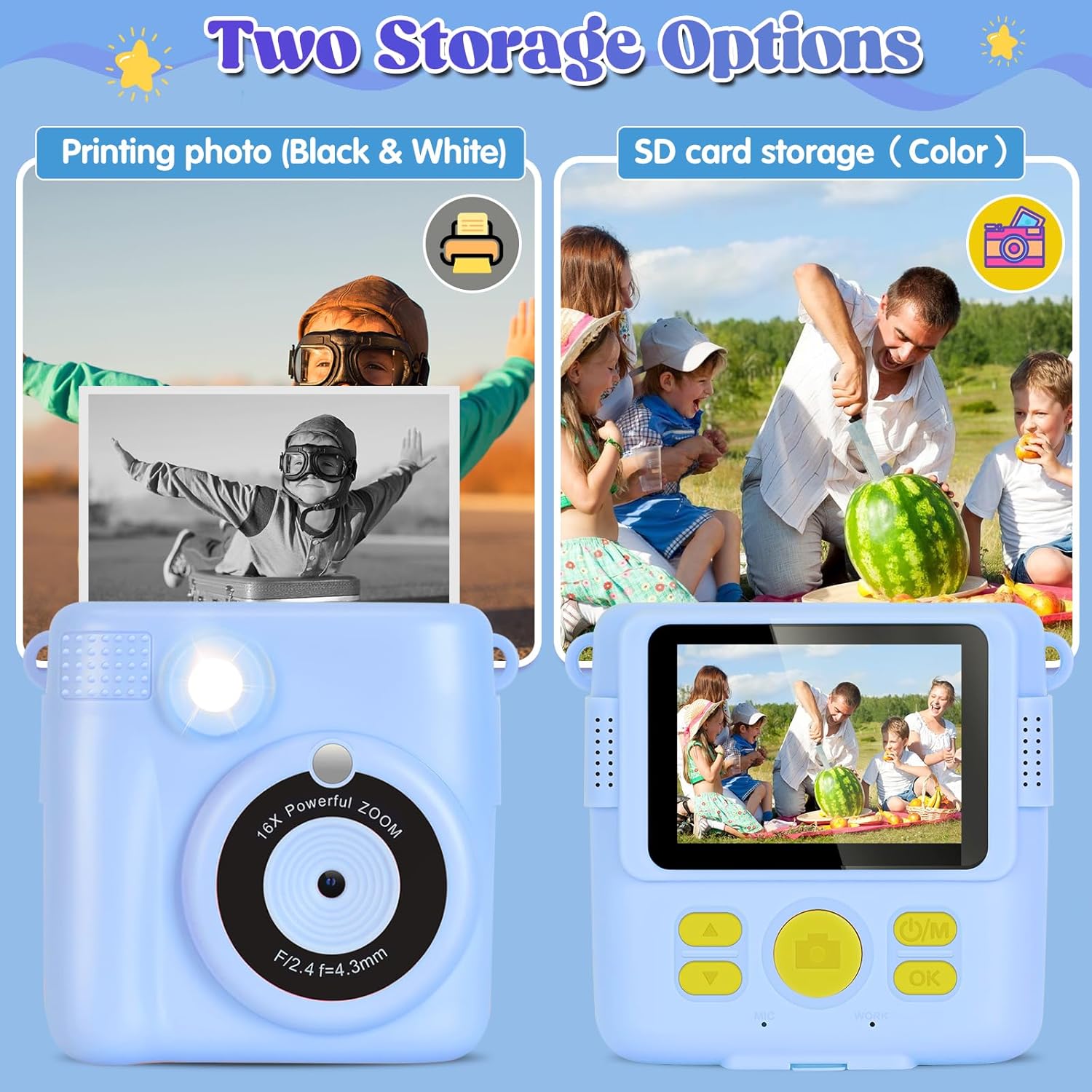 - Children's Gifts That Bring Happiness:Our camera kit includes 1x Instant Print Camera,3 rolls of printing paper (can print over 350 photos), 1x 32GB memory card (can store thousands of photos), 1x lanyard, and 1x USB Type-C cable.There are 3 colors of cameras to choose from.This mini camera toy is the perfect birthday, Easter, Christmas, holiday gifts for boys and girls aged 3-12.Let your kids have their first toy camera