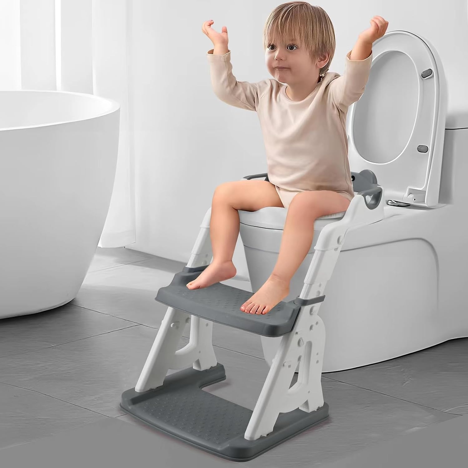 - Safe and Stable: Designed with non-slip hand grips and anti-slip steps, this potty seat ensures stability and safety. The broad, non-slip base keeps the seat securely in place on various surfaces