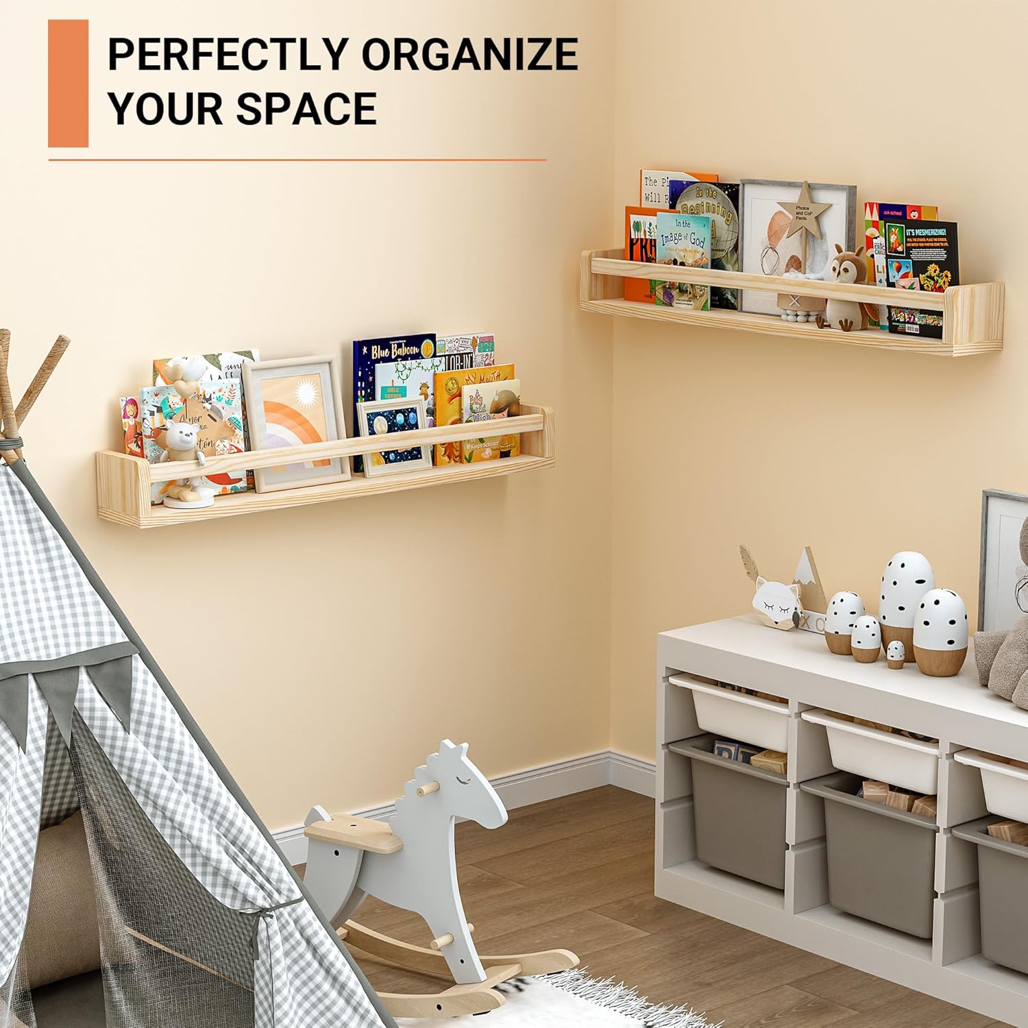 - [Ample Storage Space] - Measuring 31.8 inches, these nursery shelves offer ample room for organizing children's books, toys, photos, and other small items. They encourage a love for reading while keeping spaces tidy. With 0.6” thicken panels, each bookshelf can hold up to 30 LBS