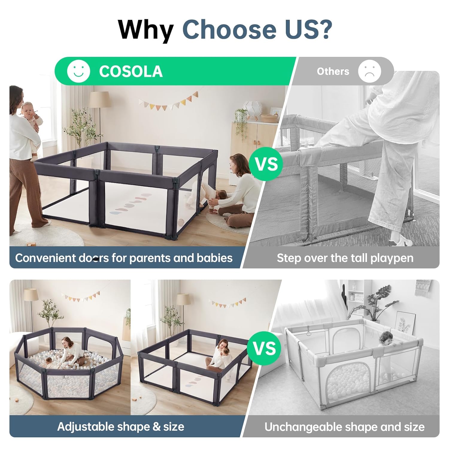 - 【Portable Baby Playpen】COSOLA foldable playpen can be folded easily and put in the trunk, you can take it with you when you go visit family or friends, provide a safe play area for babies. Keeping your toddler in a playpen and keep them insight, knowing they are safe there, free your hands to do other work. When baby is not there, you can easily fold up the play pen put it out of the way