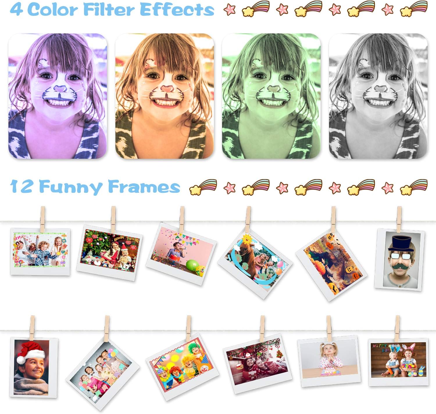 - [ 12 Frames and 4 Filters ] - The cameras for children built-in 12 fun frames and 4 filter effects allow them to choose freely to add creativity and fun to photos. It will encourage children to use their imagination to create personalized photos through different frames and filters.The camera for kids has a front lens for selfie, they also can set the time-lapse for shooting.